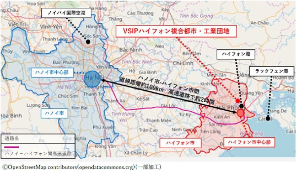 本物件が立地するVSIPハイフォン複合都市・工業団地は、下図のとおり、ベトナム北部最大の港湾都市であるハイフォン市に位置しており、また同市と首都ハノイ市は主要幹線道路で結ばれておりアクセスに優れていることから、広域物流拠点として高い優位性を有しています。