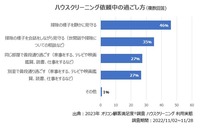 - ハウスクリーニング依頼中の過ごし方は「掃除の様子を静かに見守る」が46%と最多