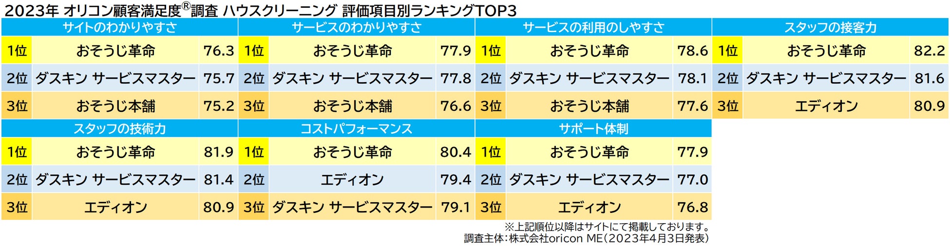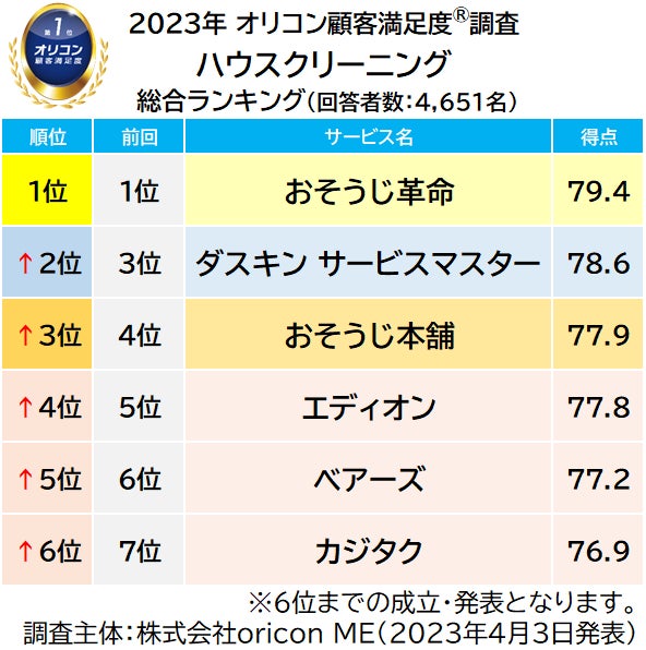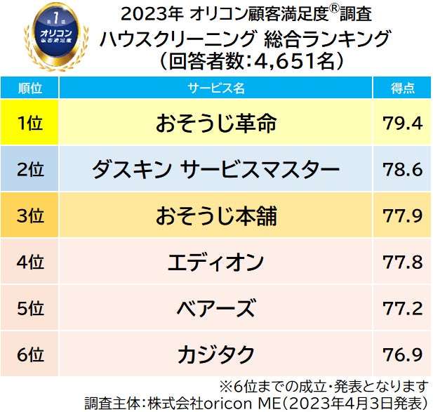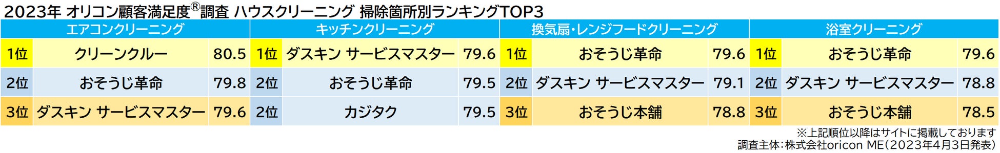 実際のサービス利用者を対象に第三者の立場で顧客満足度調査を実施する株式会社oricon ME(本社:東京都港区 代表取締役社長:小池 恒 略称:オリコン)は、『ハウスクリーニング』についての満足度調査を実施し、2023年4月3日(月)14時にその結果を「オリコン顧客満足度®」公式サイト内( https://life.oricon.co.jp/ )にて発表いたしました。ランキングの結果は、下記の通りとなりました。