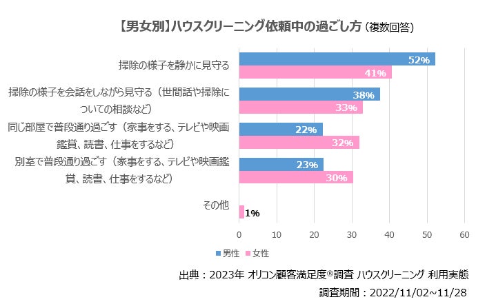 一方、女性の場合は、男性と比べ清掃スタッフの作業中は家事やテレビ鑑賞、仕事などをする人が多い傾向にあることがうかがえます。