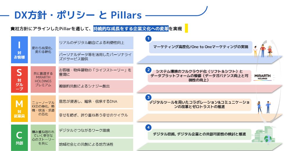 この取り組みにおいては、当社が策定した「DXポリシー」における『Innovation(I)』,『Synergy(S)』,『Managed-Infrastructure(M)』,『Co-creation(C)』の4つを軸に、両社は以下の活動を協力し行います。