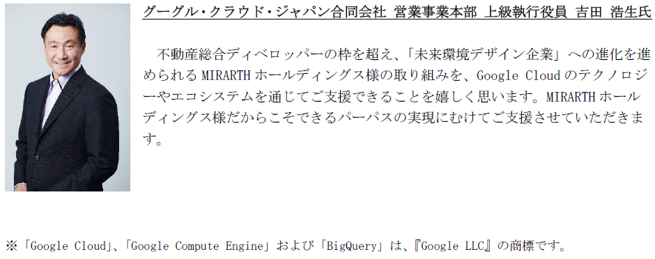 MIRARTHホールディングス(本社:東京都千代田区/代表取締役:島田和一)は、「サステナブルな環境をデザインする力で、人と地球の未来を幸せにする。」というパーパスの実現に向けて、挑戦を続けております。この挑戦をテクノロジーの側面で推進していくため、グーグル・クラウド・ジャパン合同会社(本社:東京都港区/代表者:平手智行、以下「 Google Cloud 」)とのJBP(ジョイントビジネスプラン)締結に合意しましたので、お知らせいたします。