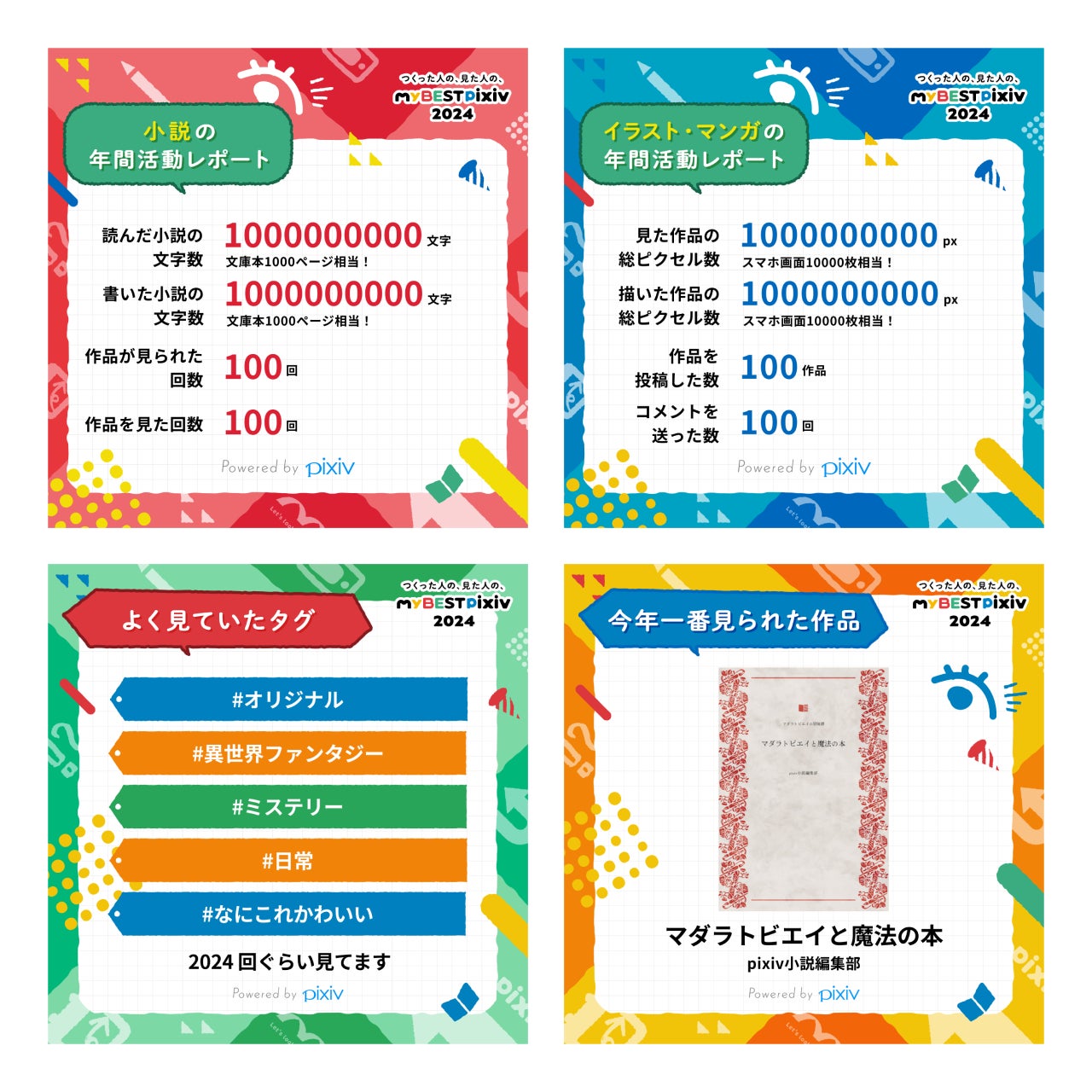 本企画では、投稿した小説作品から簡単に画像を作成し、SNSでシェアできる機能「pixiv小説画像メーカー」を使って、2024年の活動を振り返ることができます。