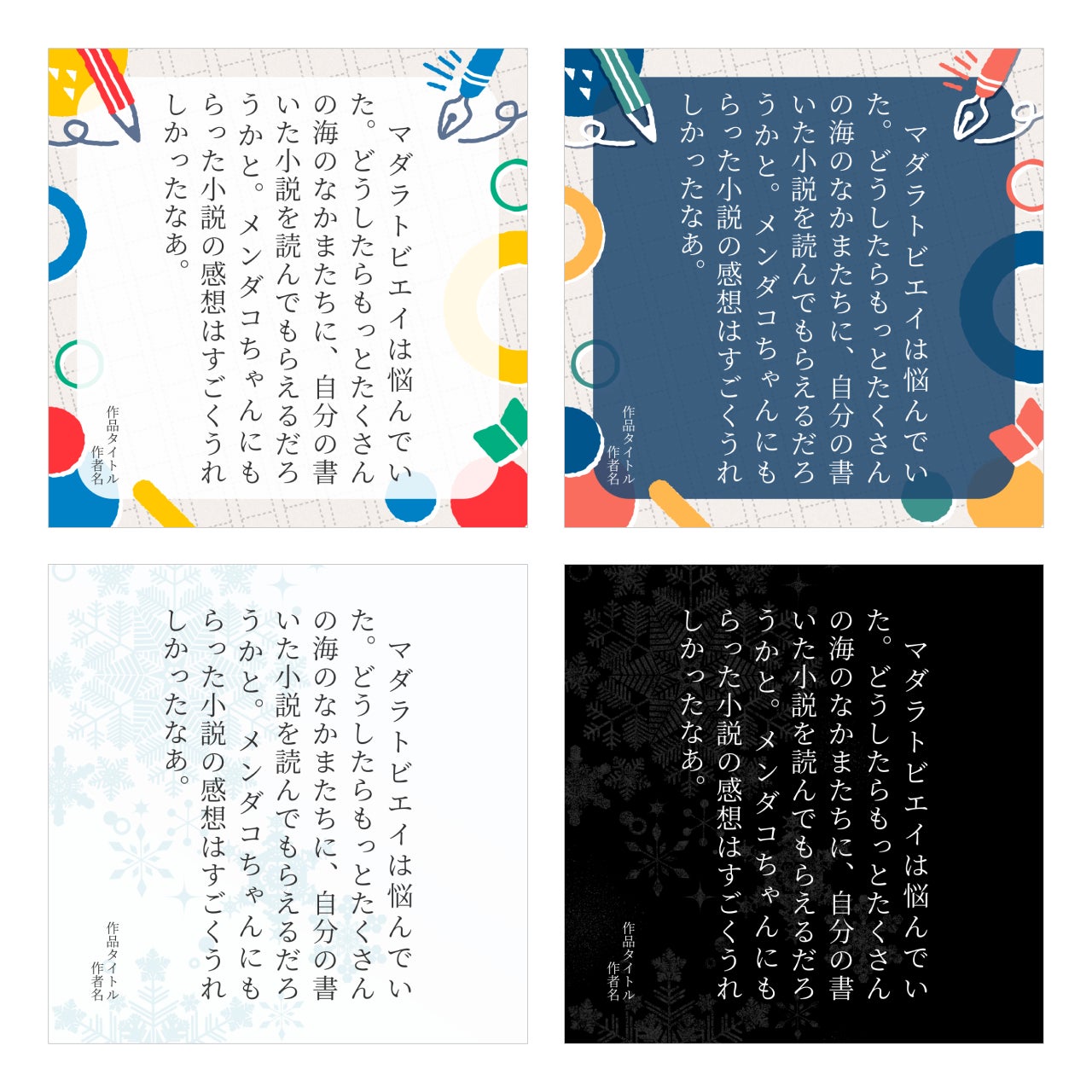 「myBESTphrase2024」の開催に合わせて、pixiv小説画像メーカーのテンプレート4種を期間限定で追加します。myBESTpixivデザインのテンプレート2種と、冬らしい雪をデザインしたテンプレート2種のいずれかを使い、SNSへ画像をシェアするとハッシュタグ「myBESTphrase2024」がついて投稿されます。