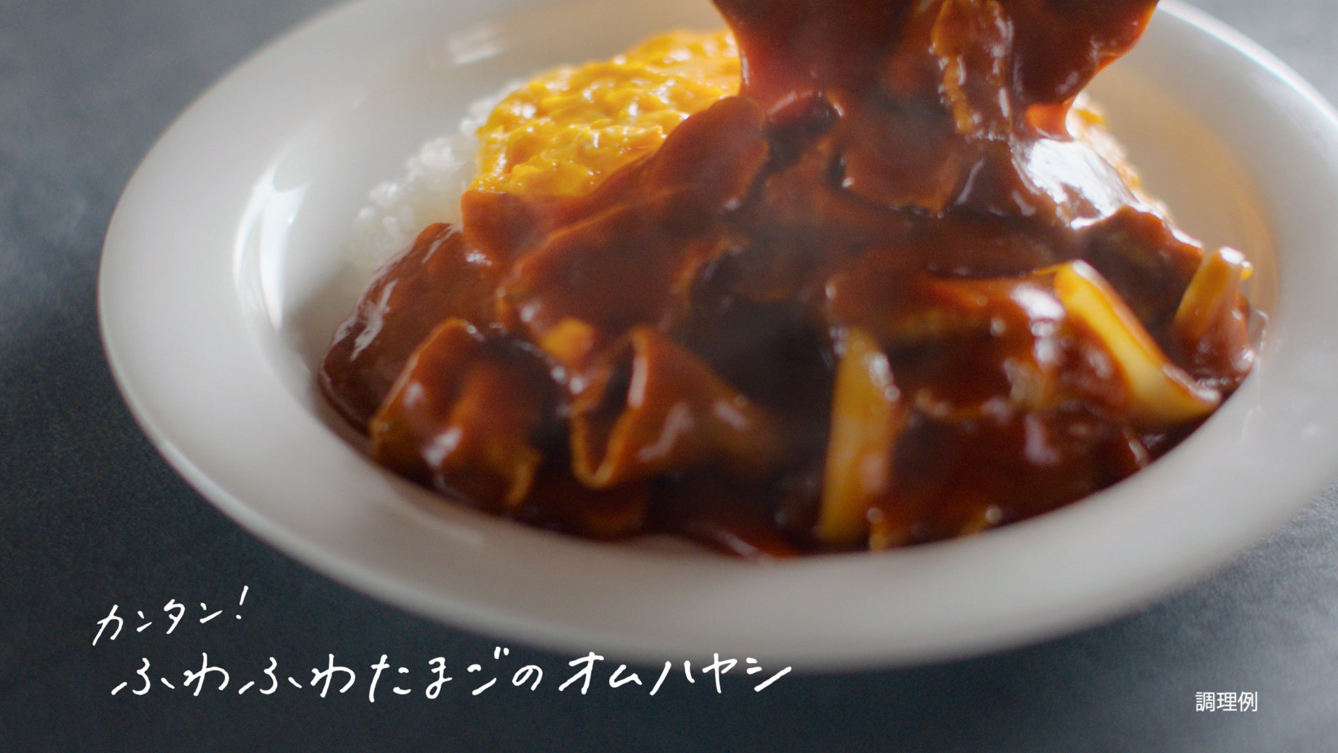 フライパンでできる簡単調理で、あっという間に「ふわふわたまごのオムハヤシ」が完成し、