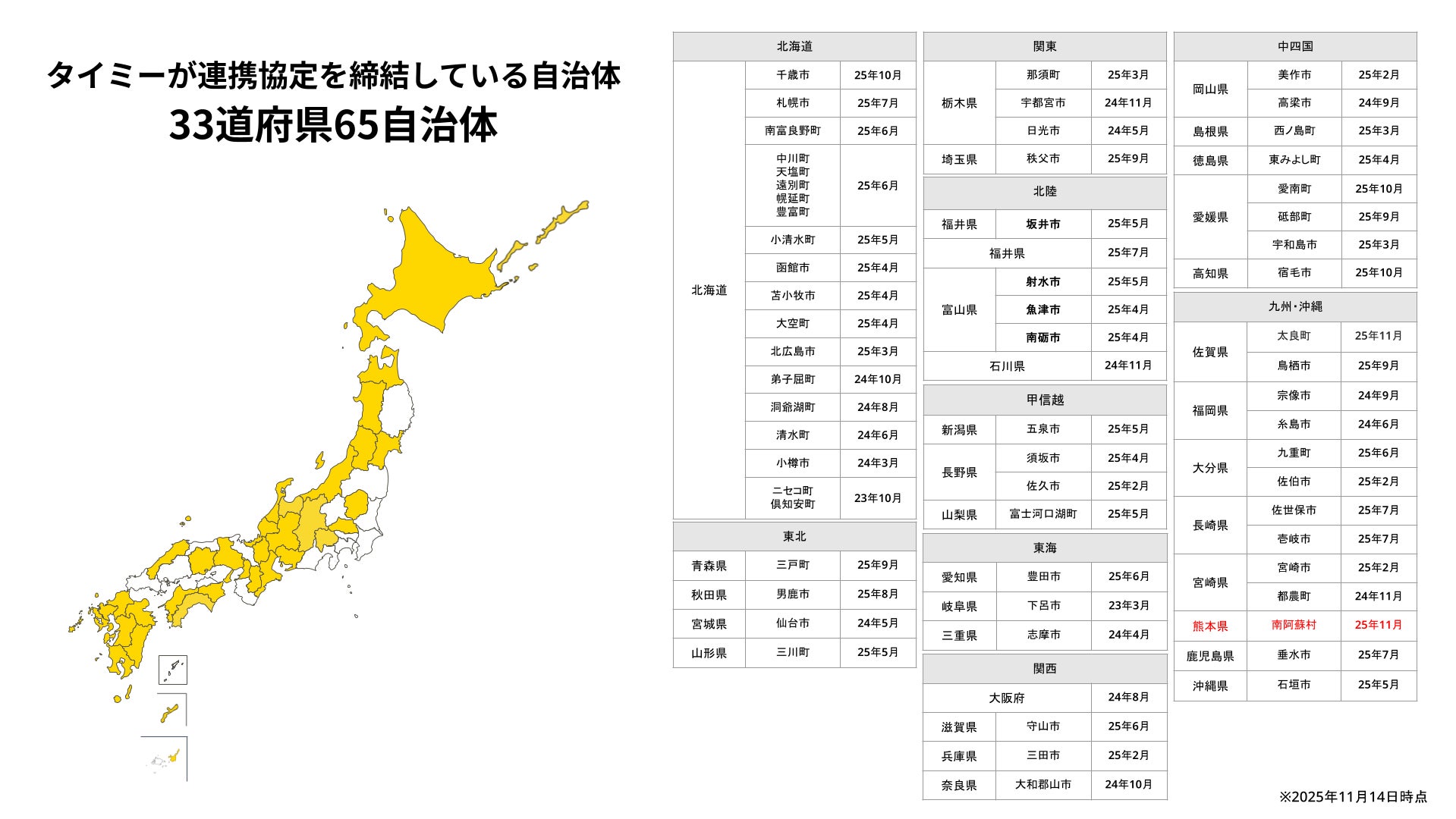 当社はこれまで32道府県・64自治体と連携協定を締結しており、今回の南阿蘇村との連携は33道府県・65自治体目となります(※)。なお、熊本県内の自治体との連携は今回が初です。