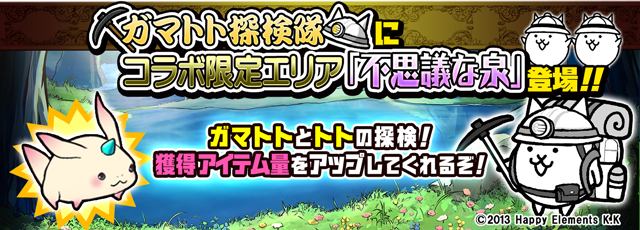 イベント期間中、「ガマトト探検隊」に「メルクストーリア」キャラクターのトトが登場し、獲得アイテム量がアップします。さらに期間中はコラボ限定エリア「不思議な泉」が出現!