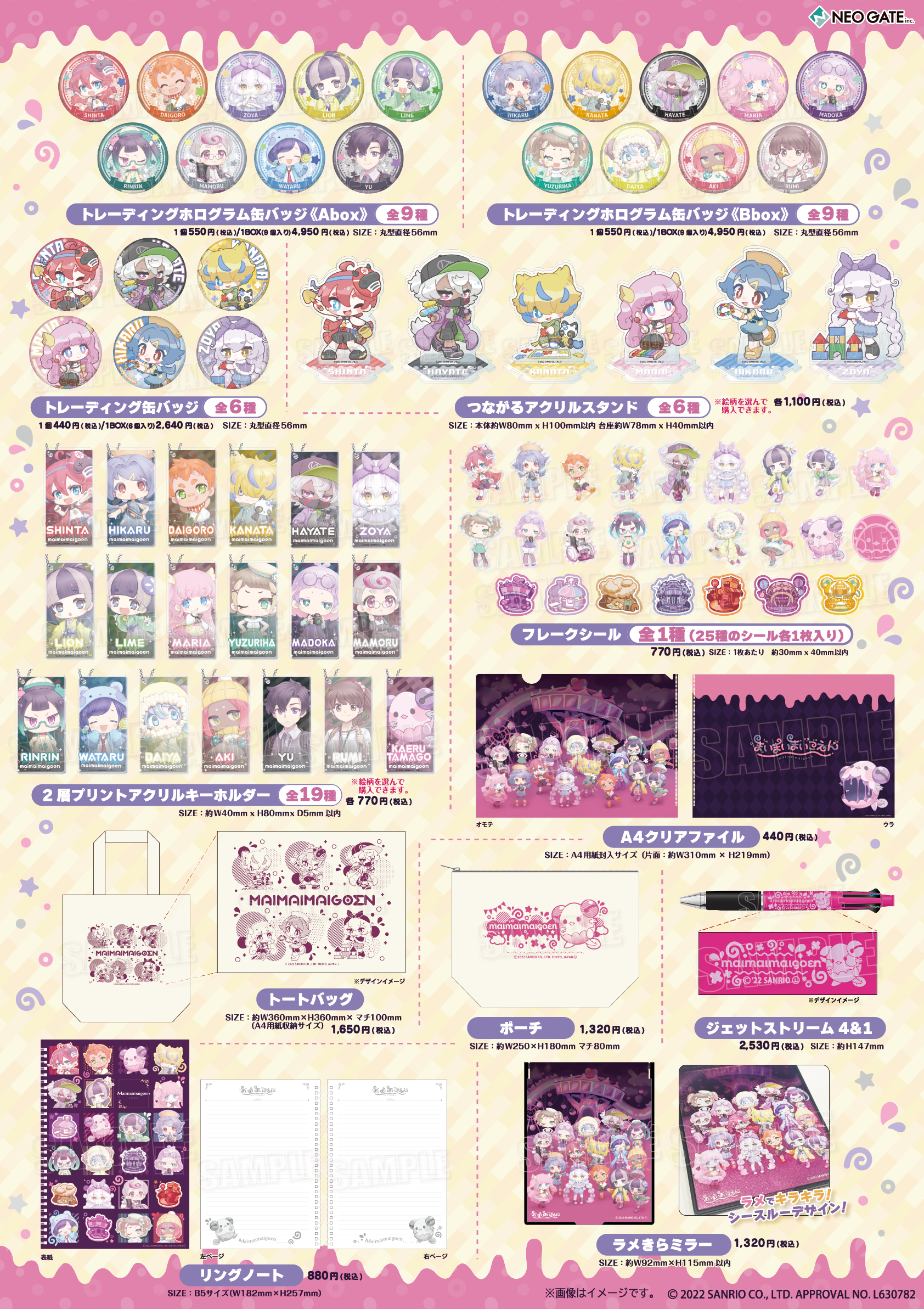 フェアにあわせてアニメイト限定グッズが11種類発売となり、期間中アニメイト各店(池袋本店・大阪日本橋・名古屋・仙台・福岡パルコ)にて『まいまいまいごえん』関連のキャラクターグッズをご購入1,100円(税込)毎または、書籍をご購入1点毎に[特典ポストカード(全4種)]をランダムで1枚プレゼント致します。