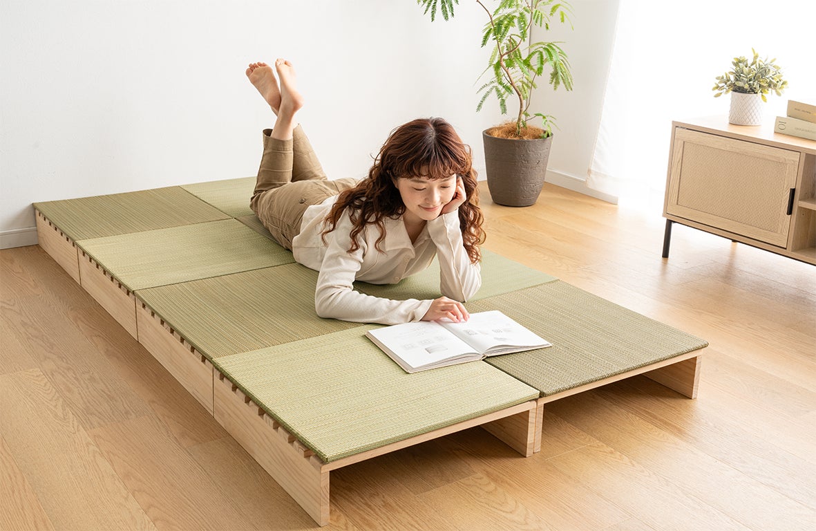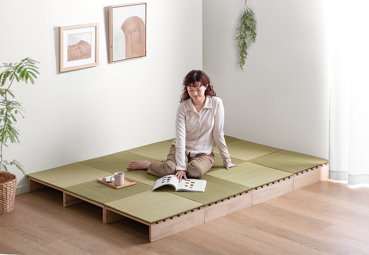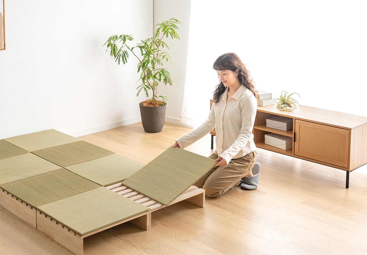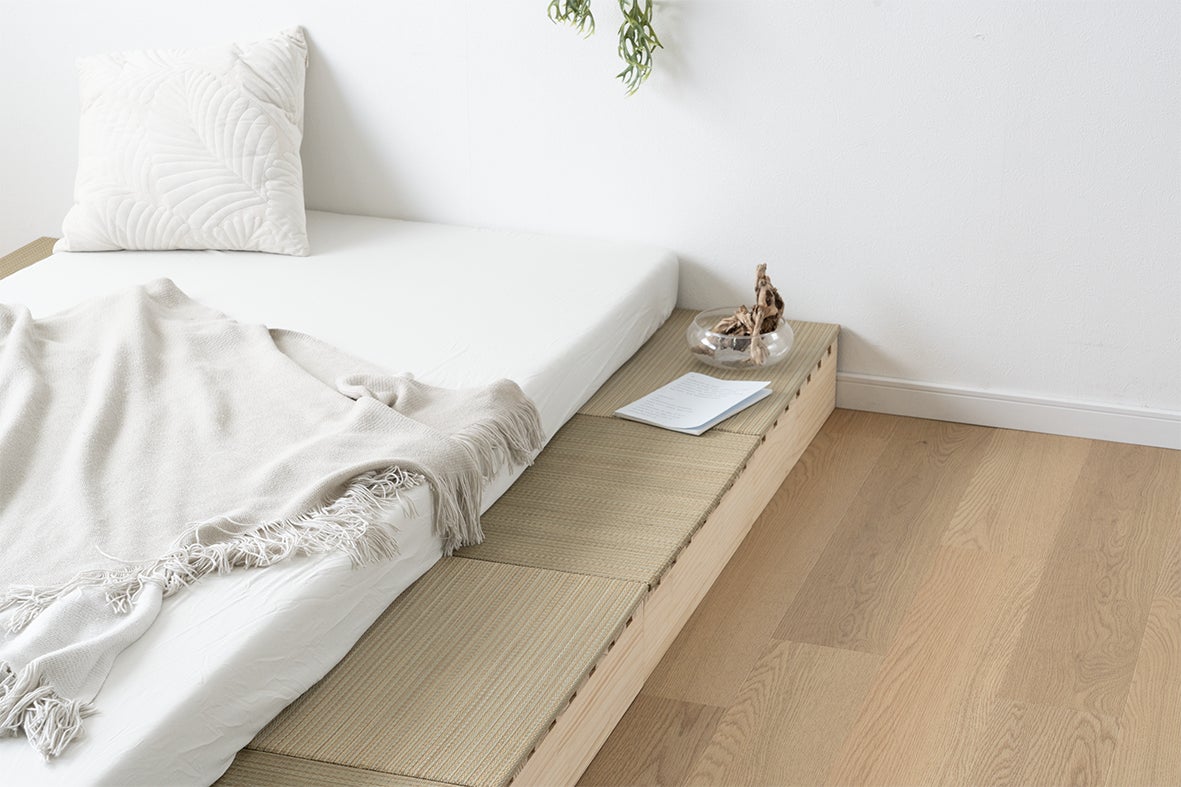 【タンスのゲン】パレットベッドの市場を開拓・普及を進めるタンスのゲンから新たな可能性を提案。天然い草の香りに包まれる和空間を自在にカスタマイズ。布団スタイルや小上がりとしても活躍。