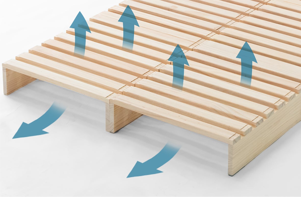 角を丸く仕上げてケガを防止し、すのこ構造で通気性が良く、寝汗や湿気がこもりにくいため、カビの発生を抑え、梅雨の時期でも一年中快適な睡眠環境をサポートします。