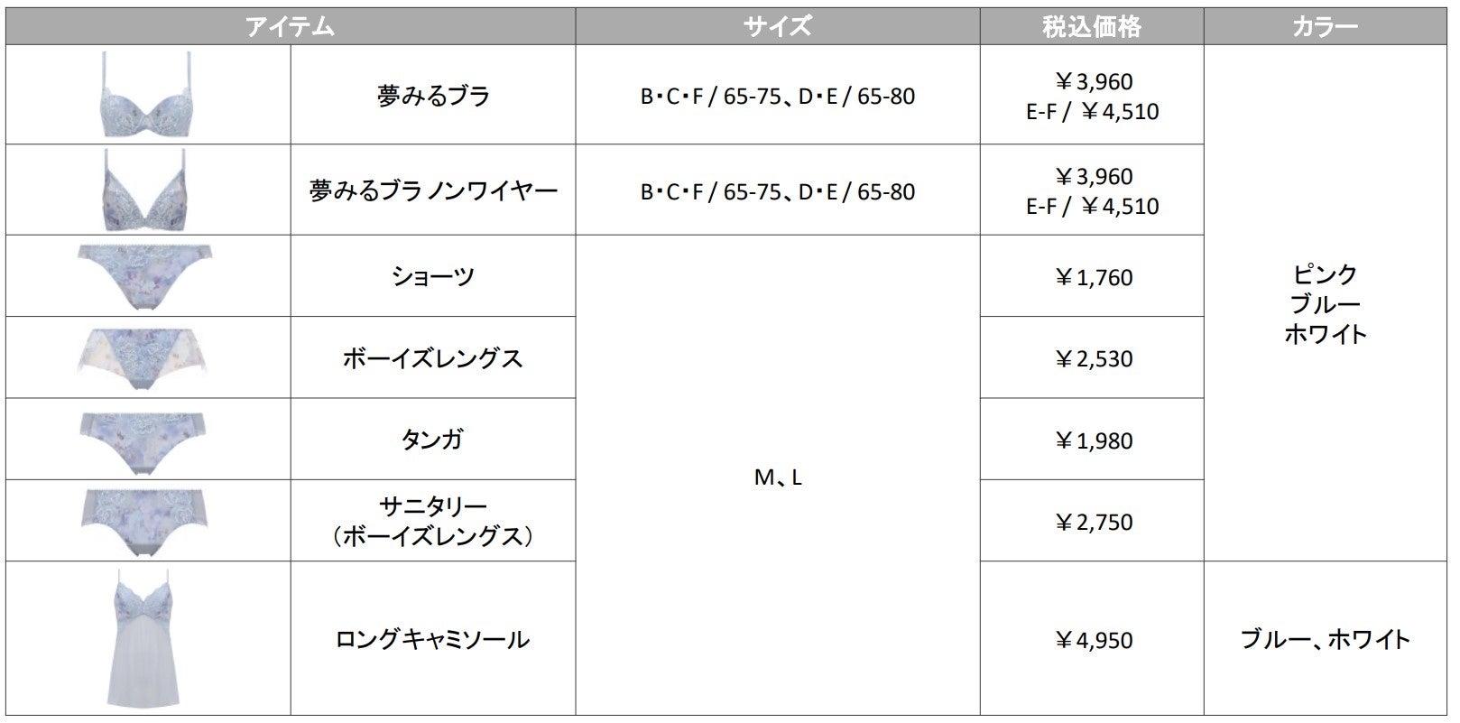 ブラジャーは、通気性に優れたエアリーシュガーパッドを採用した2フィット「夢みるブラ」と「夢みるブラ ノンワイヤー」がエントリー。デザインもフィットも軽やかな、春らしいシリーズの登場です。