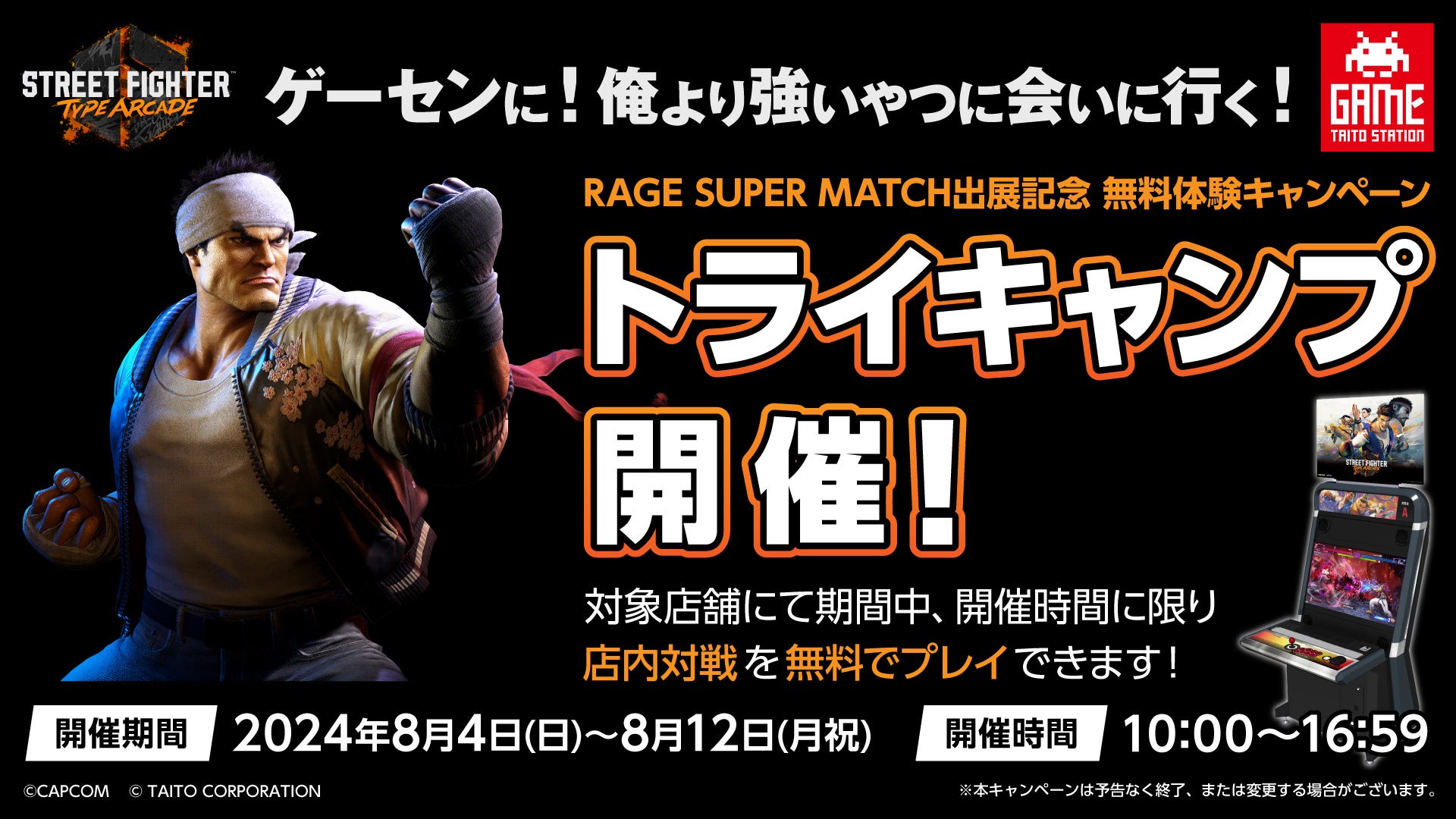 株式会社タイトー(本社:東京都新宿区)は、『ストリートファイター6 タイプアーケード(以下、SF6TA)』において、「RAGE SUPER MATCH Powered by Rakuten Optimism」出展を記念し、2024年8月4日(日)~8月12日(月祝)※の期間に全国のタイトーステーション13店舗にて、店内対戦が無料でプレイできる体験キャンペーン「トライキャンプ」を開催いたします。(※期間中、一部開催時間限定)