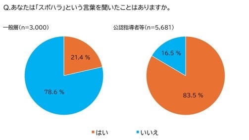 「スポハラ」という言葉を聞いたことがある人の割合は、一般層で21.4%、公認指導者等で83.5%となっており、認知度に大きな差が生じていることが分かりました。