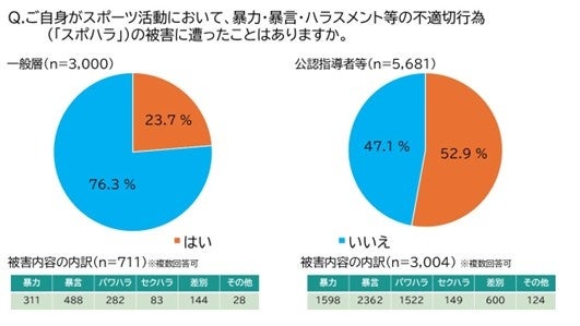 一般層は23.7%(約4人に1人)、公認指導者等は52.9%(約2人に1人)が「『スポハラ』の被害を受けたことがある」と回答しており、被害内容では「暴言」が最も多くなっています。
