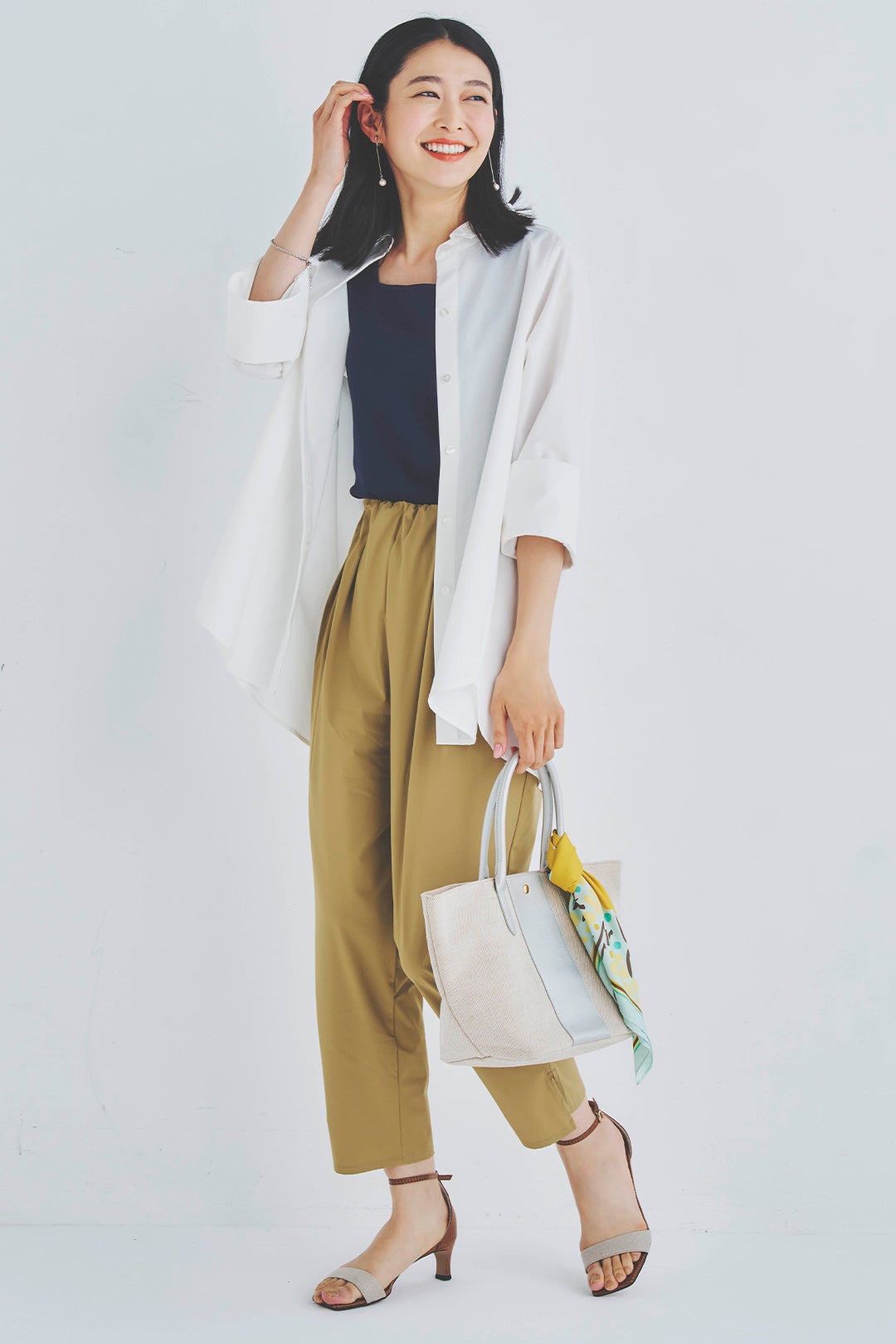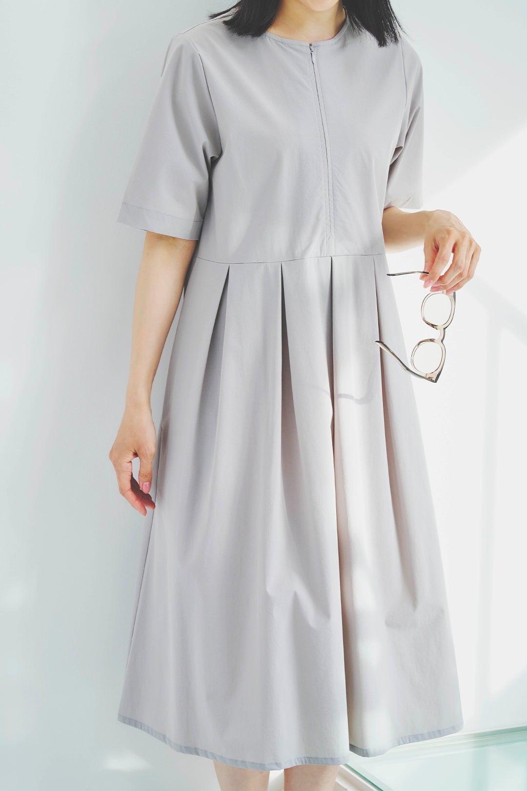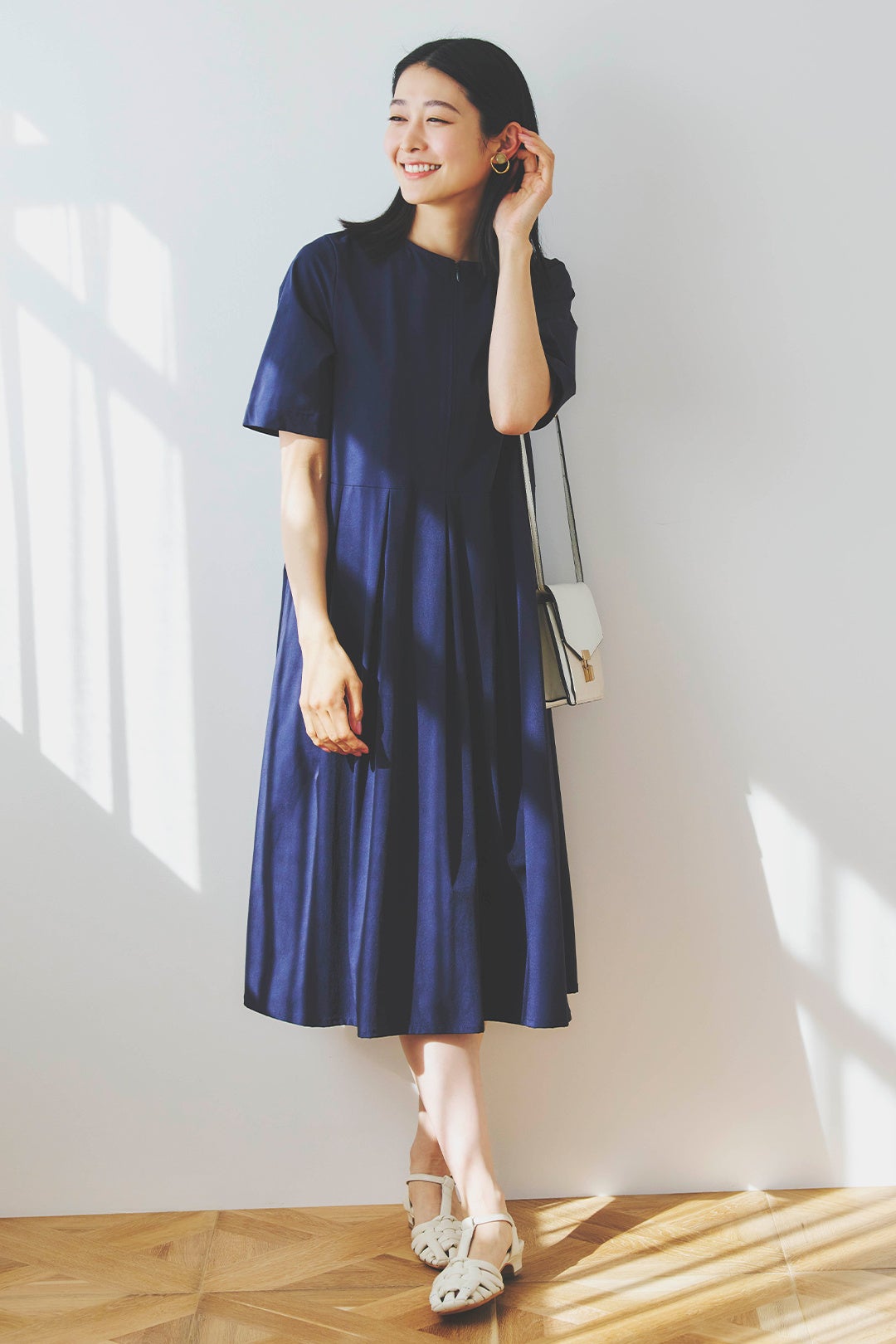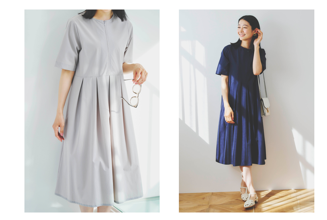 「【接触冷感・速乾】2WAYワンピース」は、ウエストの切替位置を高めにデザインすることで、スタイルアップ効果があります。また、前後2WAY着用可能でシルエットによって違う雰囲気を楽しめるのが特徴です。ファスナー仕様の前面は、タックを施しており、お腹まわりをカバーしながらメリハリのある印象に。Vカットを前に着用すると、首元をきれいに見せてくれ、緩やかなフレアデザインで柔らかな雰囲気を演出してくれます。カジュアルになりがちなタフ素材ですが、きれいめなデザインによってシーンレスで活躍するアイテムです。「【接触冷感・速乾】タックテーパードパンツ」はエレガントな雰囲気を演出できる贅沢なタックギャザー入り。裾に向かって緩やかに細くなるきれいなシルエットと立体的なデザインが気になる体型をカバーしてくれます。ストレッチが効いている素材で、窮屈感がなく動きやすいのもポイントです。