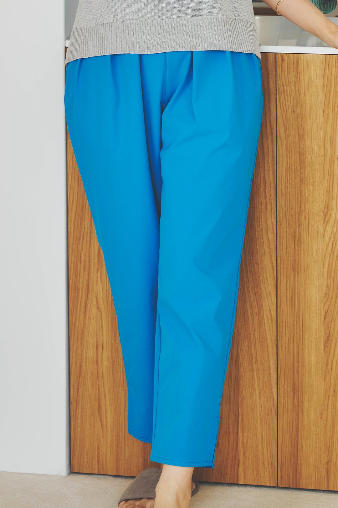 総ゴムのウエスト、ストレッチ素材で動きやすく、窮屈感のないストレスフリーな仕立てになっているテーパードパンツ。ウエストにギャザーを寄せることで、インスタイルもアウトスタイルもバッチリきれいに決まります。どんなアイテムにも合わせやすいので着回しのしやすさもポイントです。