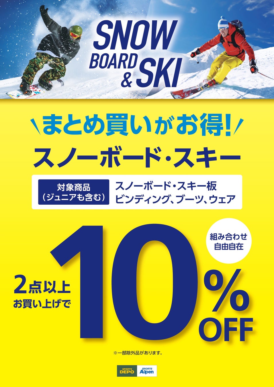 内容:スノーボード、スキー板、ブーツ、ビンディング、スノーウェアを2点以上お買い上げで10%OFF(組み合わせは自由自在)