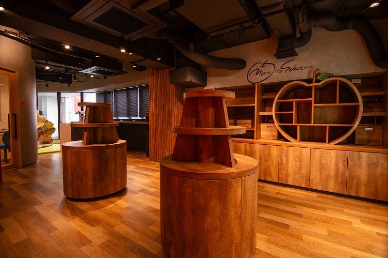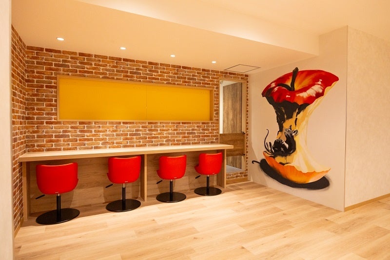 ボルダリングの壁や、リンゴのアートが印象的な広いフリースペース