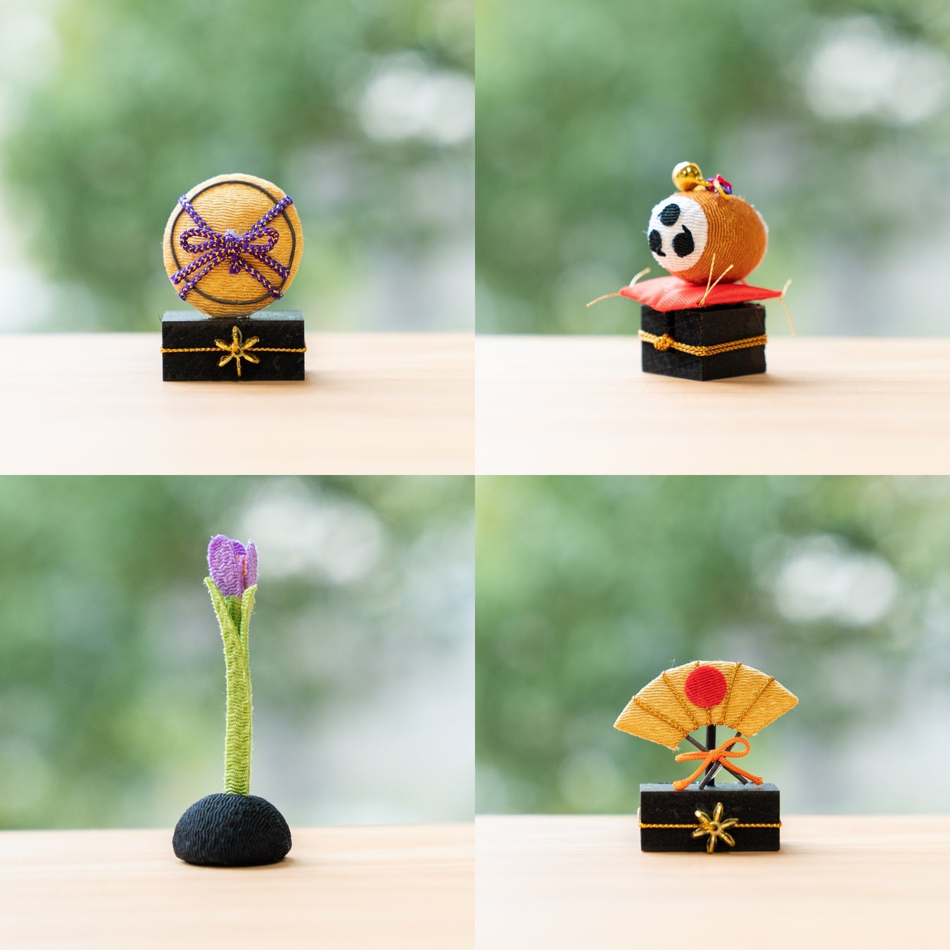 →扇子、陣傘、太鼓などの小物は京都で作られたちりめん細工です。やわらかく素朴な雰囲気。