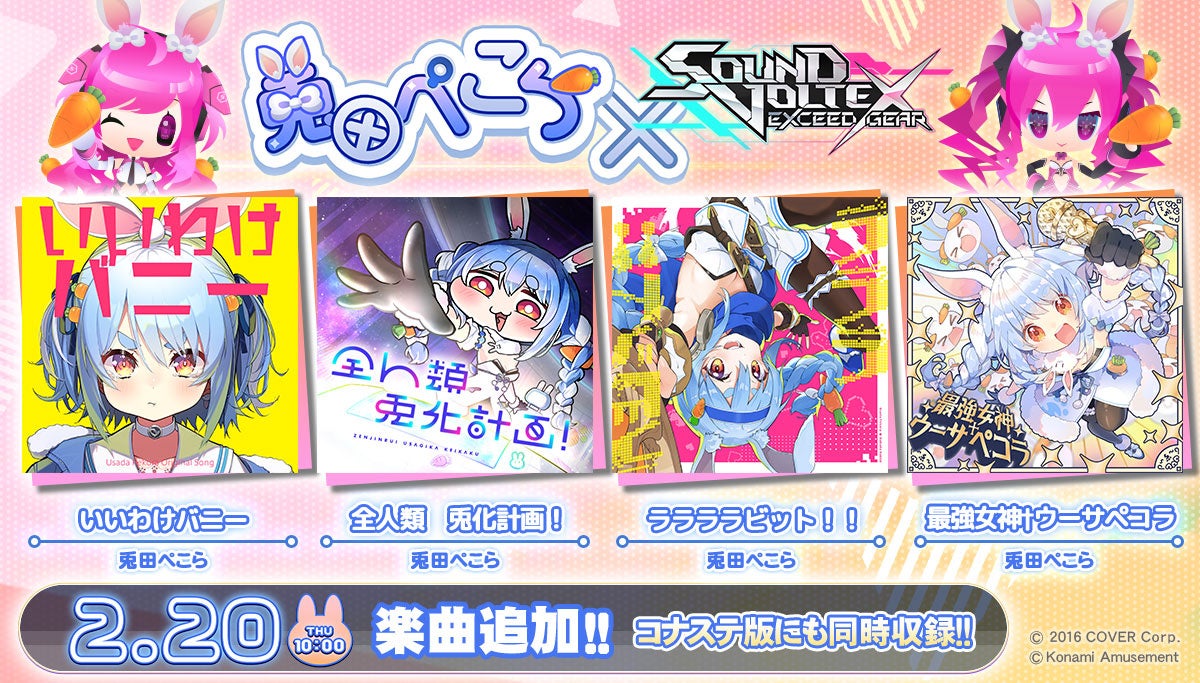 株式会社コナミアミューズメントは、『SOUND VOLTEX EXCEED GEAR(サウンドボルテックス エクシードギア)』(アーケード版およびコナステ版)と、カバー株式会社が運営する女性VTuberグループ「ホロライブ」所属の人気タレント『兎田(うさだ)ぺこら』とのコラボレーションイベントを2月20日(木)から開催することをお知らせします。