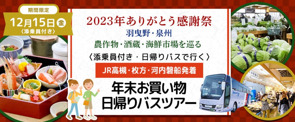 おひとり様¥13,800- おひとり様6,800円 12月15日(金) 【羽曳野・泉州】〈JR高槻・京阪枚方・JR河内磐船発着・添乗員付〉美味しい昼食&農作物・酒蔵・漁協直営魚屋を巡る 2023年ありがとう感謝祭・お買い物ツアー