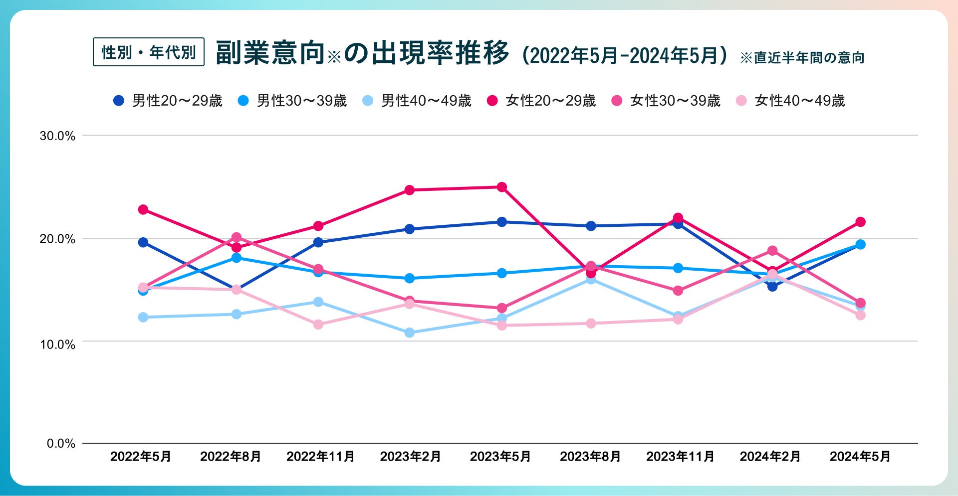 また、副業意向の推移を男女年代別で見てみると、男女ともに20代の副業意向は、前年同月比で減少しており、20代男性は21.6%から19.4%へ、20代女性は25.0%から21.6%となりました。