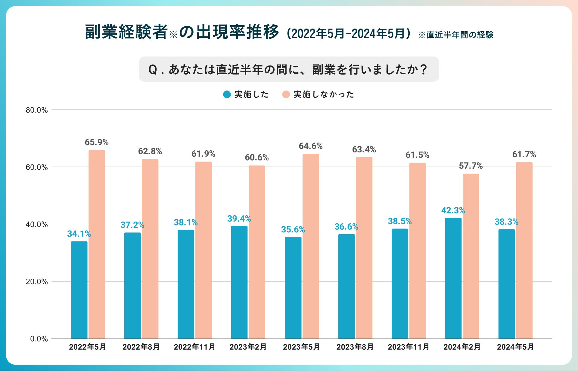 副業経験者の推移をみてみると、「実施した」の回答者率は2024年2月の42.3%から38.3%へと減少しましたが、前年同月と比べると副業経験者は増加しました。