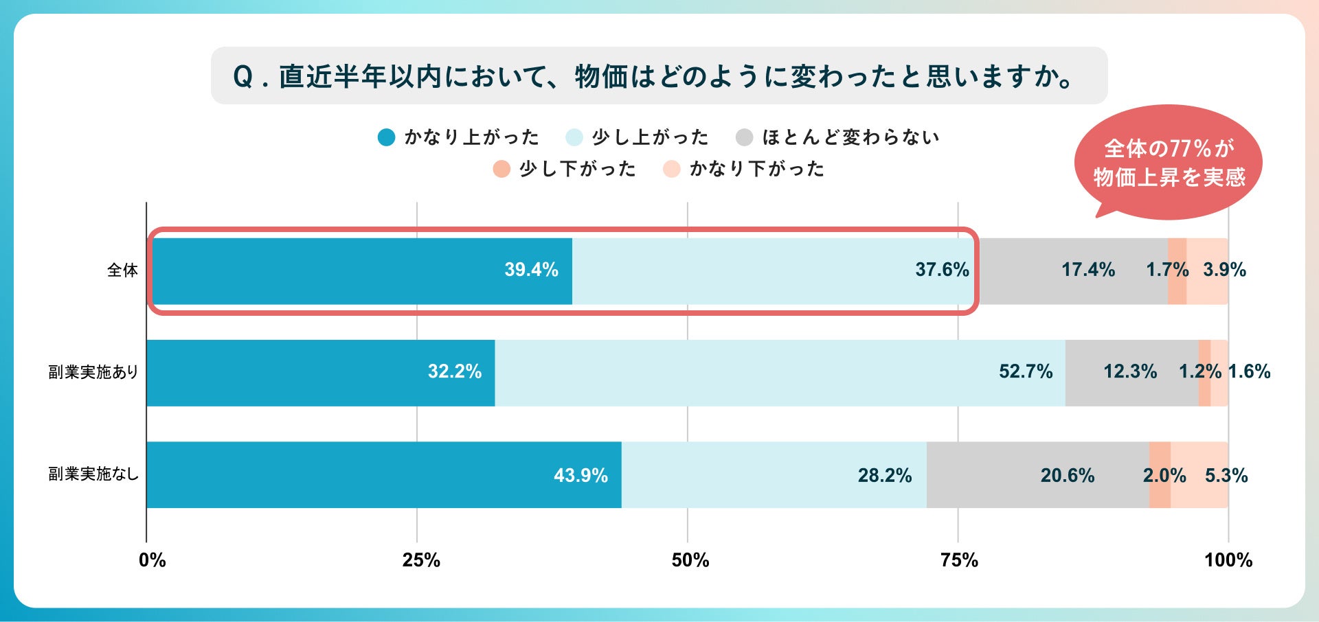 また、副業経験別でみると、副業経験者の84.9%が、物価が上がったと感じていました。全体平均より、高い水準で物価上昇を捉えていることが伺えます。