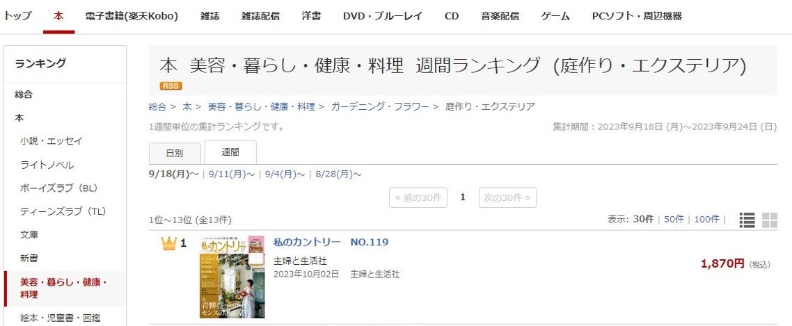 ●楽天ブックス 本 美容・暮らし・健康・料理 週間ランキング(庭作り・エクステリア)で1位を獲得しました!(2023年9月18日~2023年9月24日)