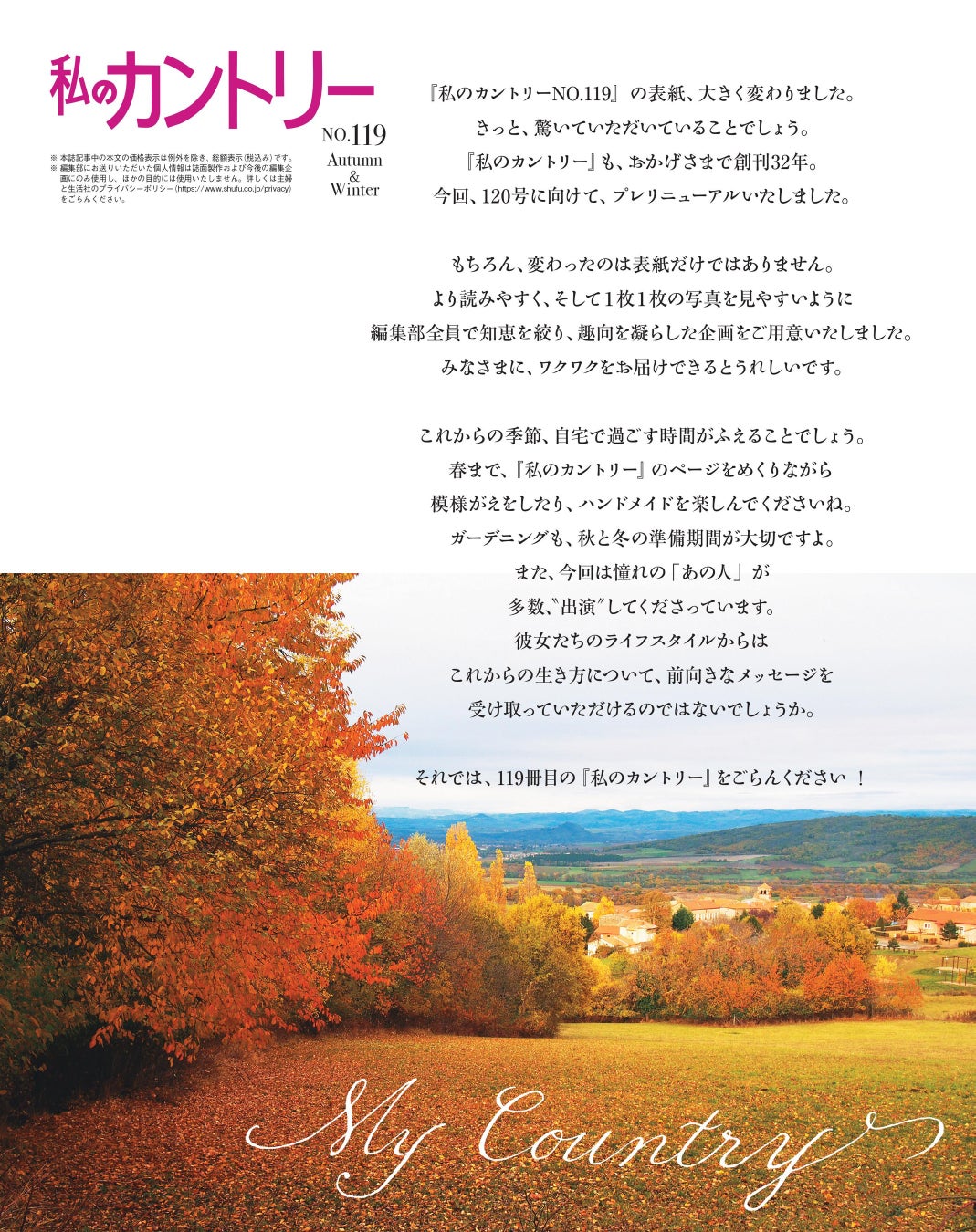 ”ナチュラルで気持ちのいい暮らし”をコンセプトに、心豊かになる暮らしのアイデアを提案し、愛され続けて32年目を迎える『私のカントリー』が、よりメッセージが伝わりやすい文章とよりインパクトのあるビジュアルへと誌面を一部、リニューアルいたしました。