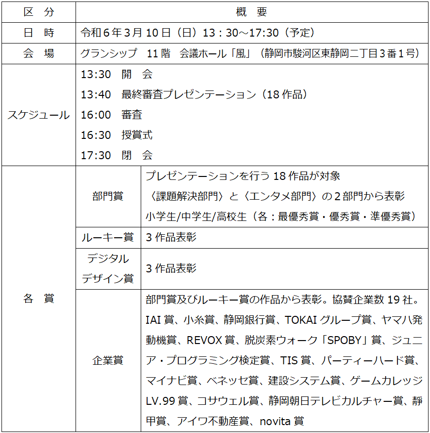 静岡県主催のプログラミングコンテストの最終審査会及び授賞式を3月10日(日)にグランシップ(静岡市駿河区)で開催します。