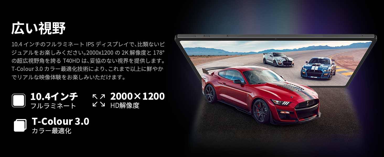 10.4インチのフルラミネートIPSディスプレイで、比類ないビジュアルをお楽しみください。2000x1200の2K解像度と178°の超広視野角を誇るT40HDは、妥協のない視界を提供します。T-Colour 3.0カラー最適化技術により、これまで以上に鮮やかでリアルな映像体験をお楽しみいただけます。