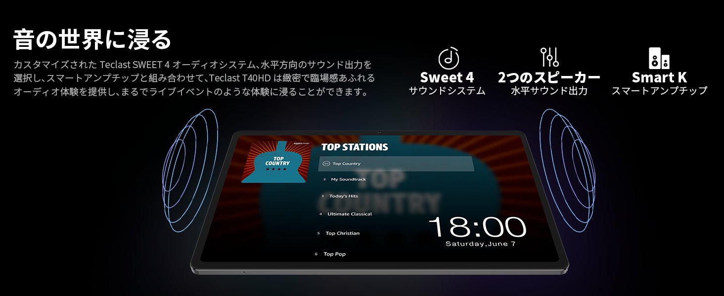 カスタマイズされたTeclast SWEET 4オーディオシステム、水平方向のサウンド出力を選択し、スマートアンプチップと組み合わせて、Teclast T40HDは緻密で臨場感あふれるオーディオ体験を提供し、まるでライブイベントのような体験に浸ることができます。