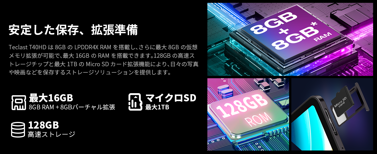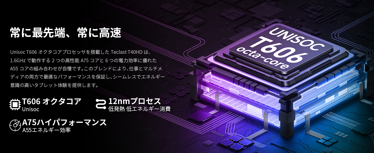 Unisoc T606オクタコアプロセッサを搭載したTeclast T40HDは、1.8GHzで動作する2つの高性能A75コアと6つの電力効率に優れたA55コアの組み合わせが自慢です。このブレンドにより、仕事とマルチメディアの両方で最適なパフォーマンスを保証し、シームレスでエネルギー意識の高いタブレット体験を提供します。