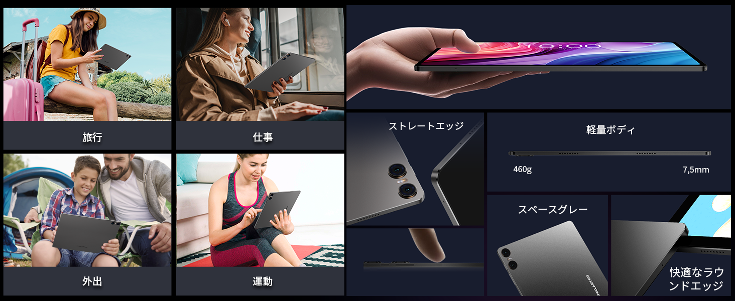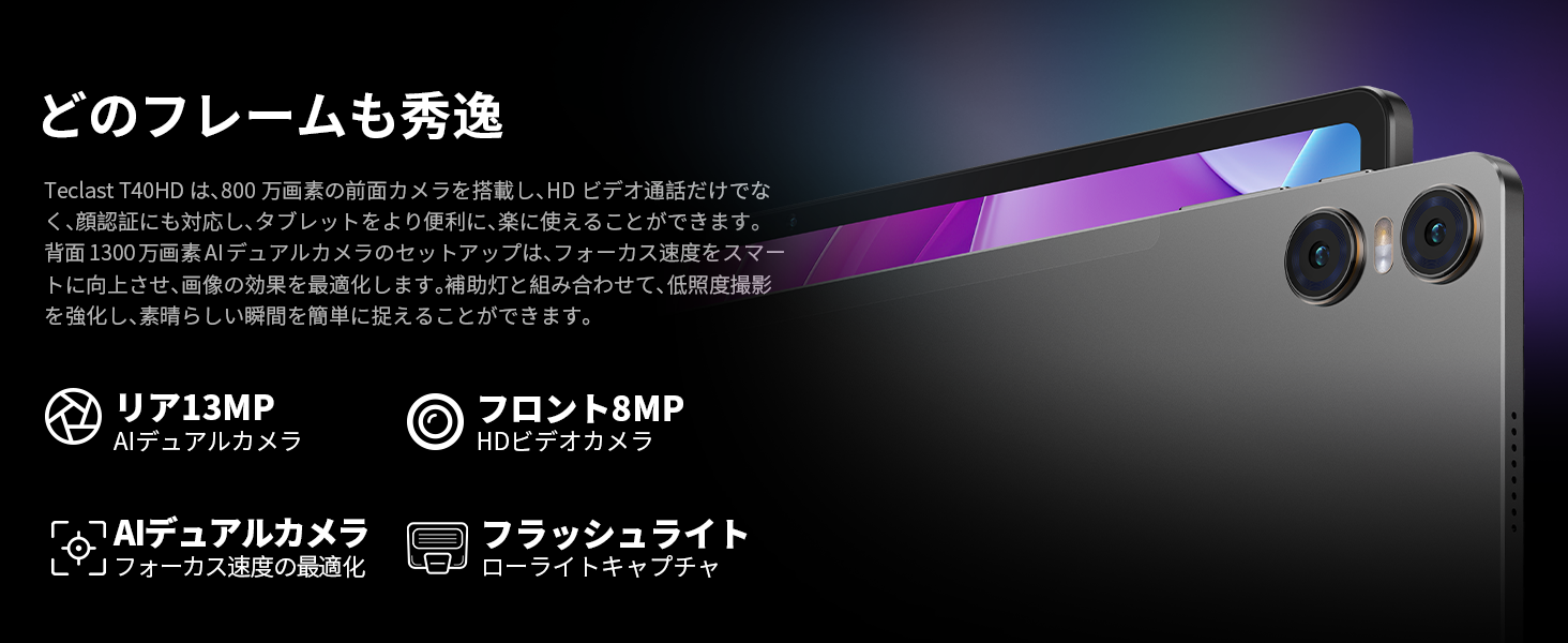 フルラミネートされたディスプレイを備えた、洗練されたストレートエッジのタブレットです。革新的なラミネート加工により、Teclast T40HDはわずか7.5mmと驚くほど薄いだけでなく、重さも約460gと驚くほど軽く、比類のない携帯性と快適な使い心地を提供します。テクノロジー、デザイン、利便性の見事な融合です。