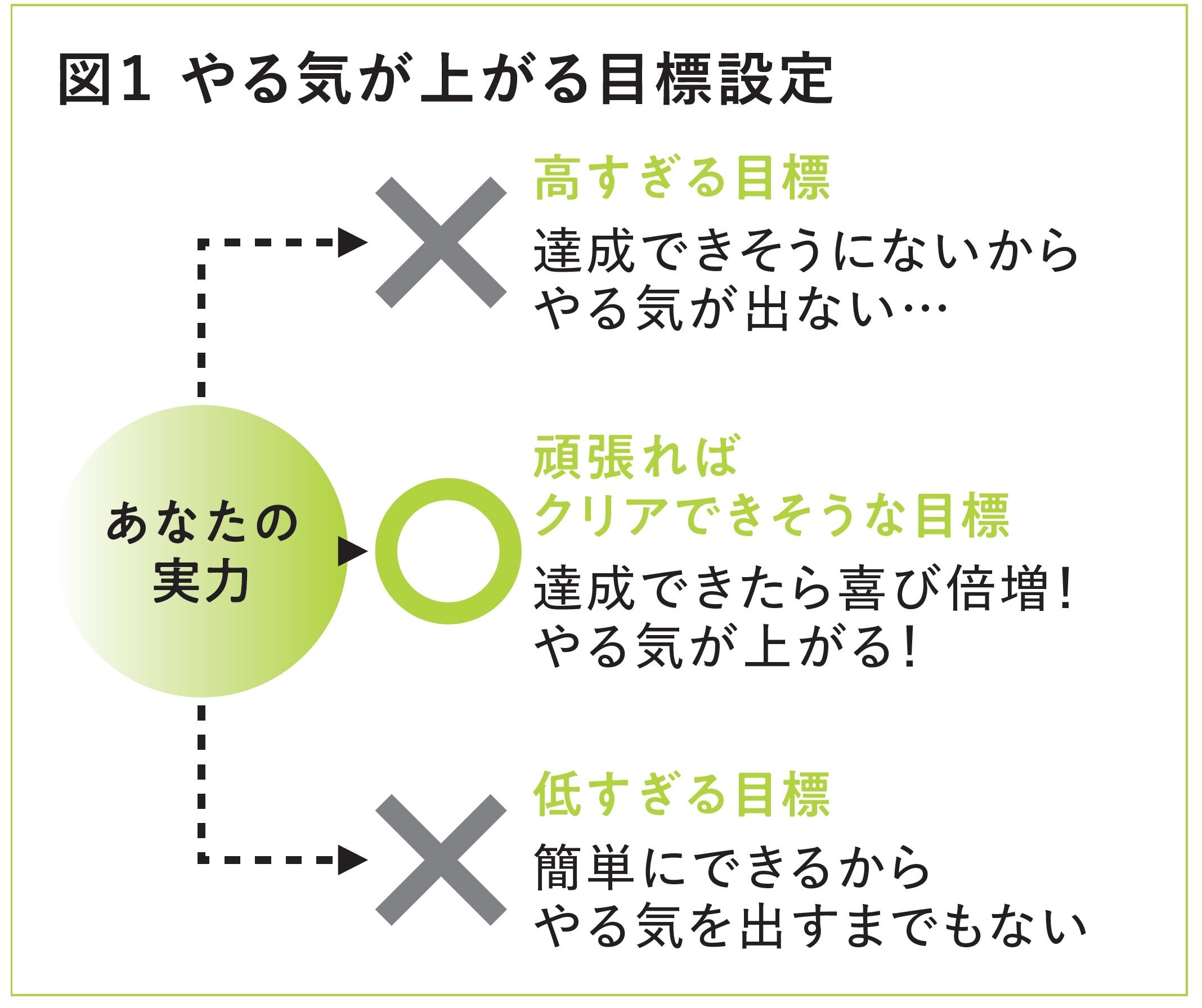 目標が低すぎるとやる気は盛り上がらず、高すぎるとしぼんでしまいます。