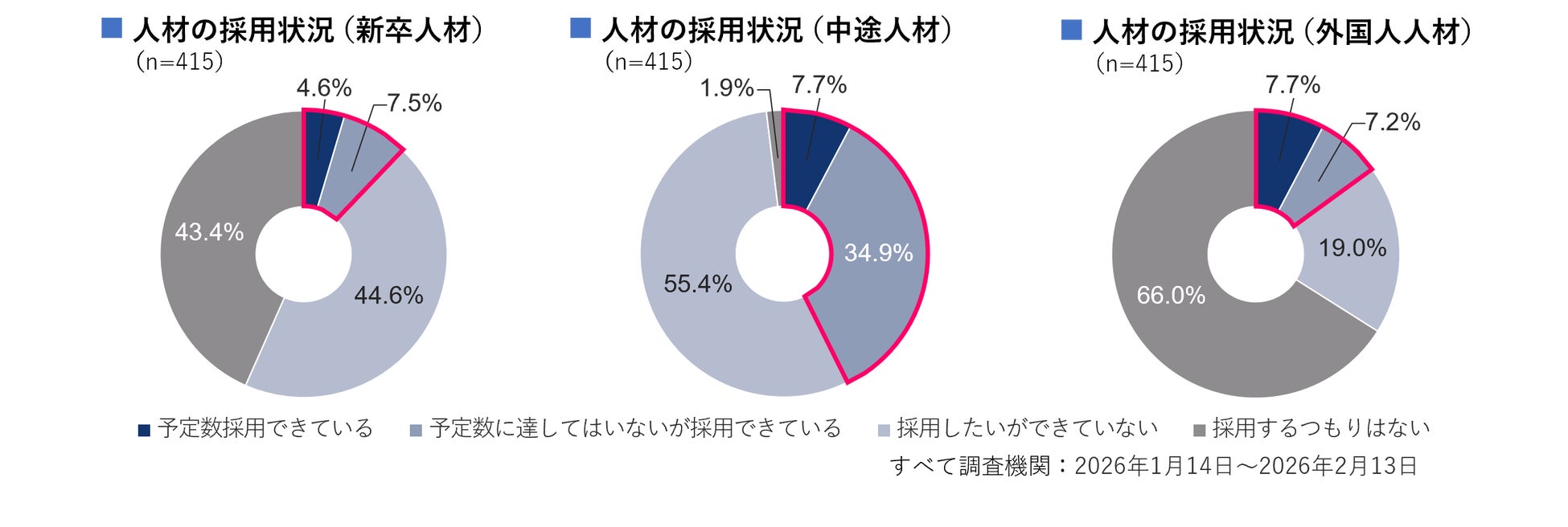 人手不足を経営課題と感じている企業の中で、対応策として「採用活動を行う」と回答した企業に、新卒人材、中途人材、外国人人材それぞれの採用状況を聞きました。