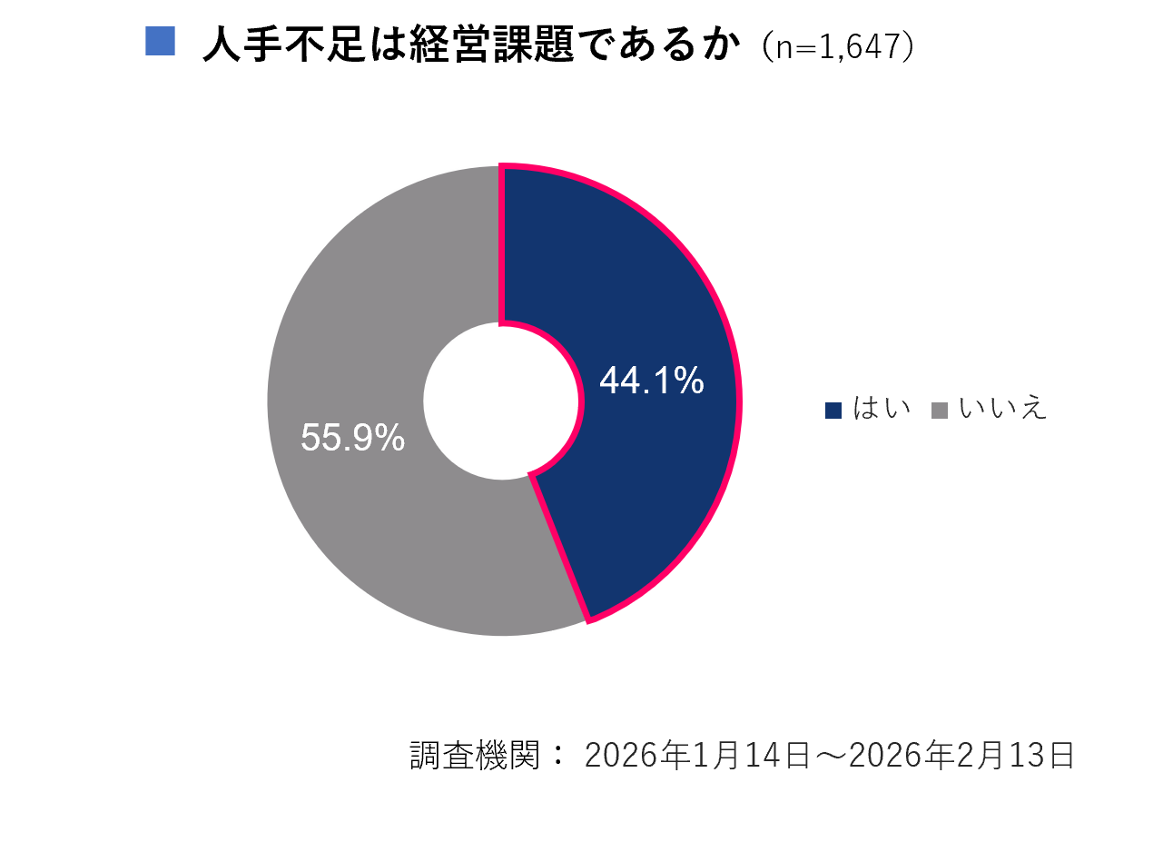 ・中小企業に対し、「人手不足は経営課題であるか」と聞いたところ、全体では44.1%が「はい」と回答しました。その結果を従業員規模別でみると、従業員数が0〜9人の企業では「はい」と回答した企業は33.5%に留まる一方、50人以上の規模では80.3%に達し、その規模が大きくなるにつれて経営課題として認識する企業の割合も大きくなることがわかりました。