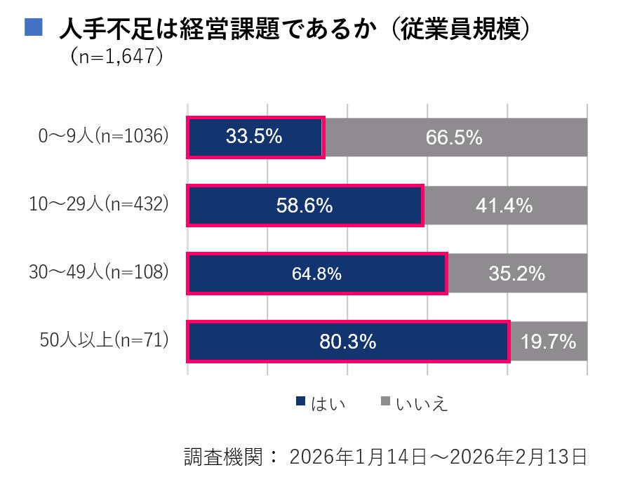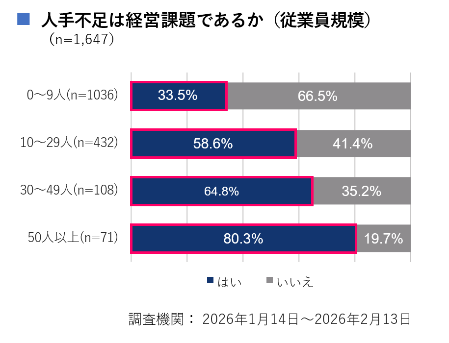 中小企業に対し、「人手不足は経営課題であるか」と聞いたところ、全体では44.1%が「はい」と回答しました。特筆すべきは規模別の差異で、上記の質問の回答を従業員規模別で整理すると0〜9人の企業(33.5%)に比べ、50人以上の企業では80.3%と2.4倍近い開きがあります。