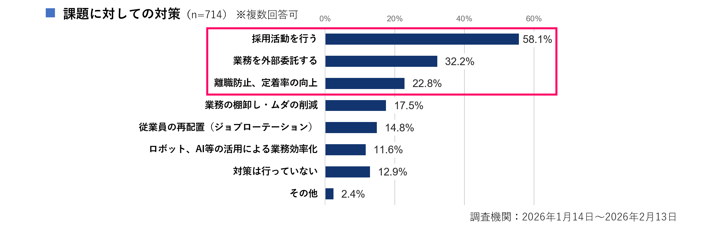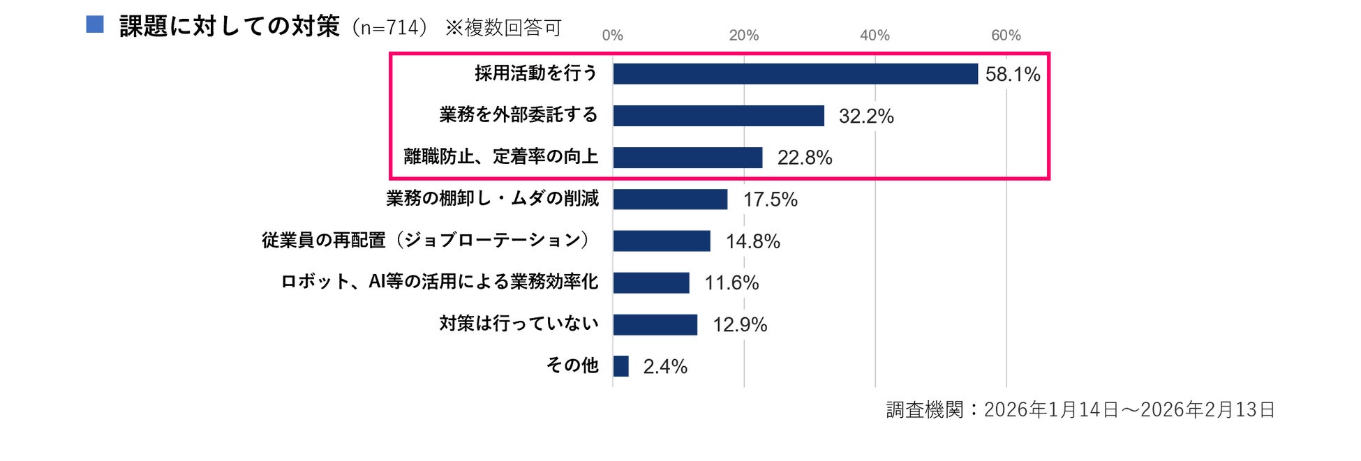 人手不足を経営課題と感じている企業に対して、どのような対策を講じているかを聞いたところ、「採用活動を行う」が回答企業中58.1%で最も多く、「業務を外部委託する」の32.2%、「離職防止、定着率の向上」の22.8%と続きました。