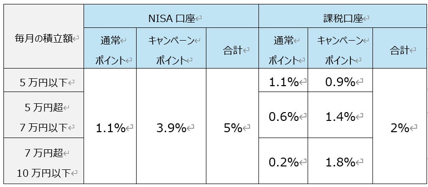 積立額 100 円につき 1 ポイント(1%ポイント進呈)、さらに1,000 円ごとに1ポイント(0.1%ポイント進呈)がたまります。