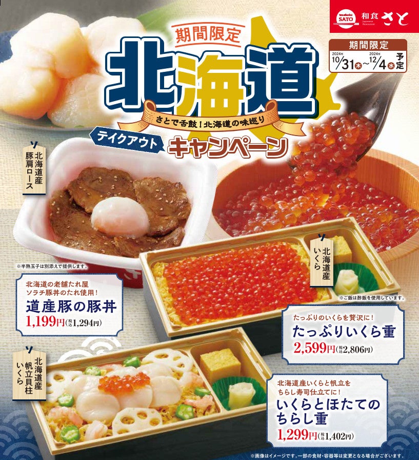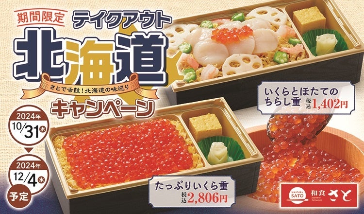 国内197店舗を展開する「和食さと」では、お持ち帰り「北海道キャンペーン」と題して、北海道産の「いくら」「帆立貝柱」「豚肩ロース」などを使ったテイクアウト限定メニューを期間限定で10月31日(木)から販売します!!今回は海鮮メニューとして、北海道産の「いくら」をたっぷりのせた「いくら重」を2,806円で販売するほか、北海道産の「帆立貝柱」と「いくら」を使いちらし寿司風に仕立てた、見た目にも豪華な「いくらとほたてのちらし重」を1,402円でご提供します!!そして、北海道産「豚肩ロース」を老舗たれ屋「ソラチ」の豚丼のたれでオーダーごとに丁寧に焼き上げた「道産豚の豚丼」を1,294円で販売!!半熟玉子をお好みで絡めてお召し上がり頂けます。