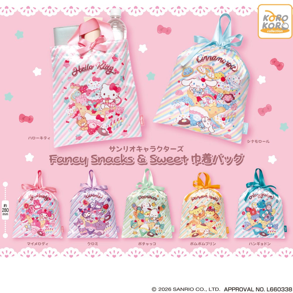 スイーツ柄×リボンで甘さ100%!「サンリオキャラクターズ Fancy Snacks & Sweet 巾着バッグ」がカプセルトイに登場!