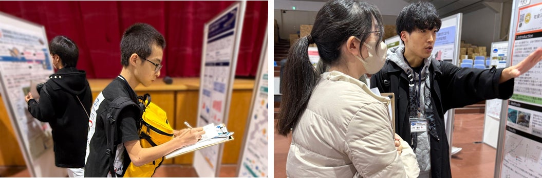 「ポスター発表」の会場には、多数のパネルが並び、多種多様な研究発表ポスターが掲示されていました。さっそく、ポスターを見て回る研究生たち。会場内は撮影禁止ですが、個人的なメモは許可されているため、各自持参したノートに熱心に書き込んでいました。