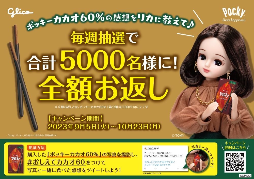 発売日と同時に、幅広い世代から愛され続けているリカちゃんが、働く女性風の大人びたファッションを身にまとい「ポッキーカカオ60%」のアンバサダーに就任。「ポッキーカカオ60%の感想をリカに教えて♪全額お返しキャンペーン」を2023年9月5日(火)から実施します。応募期間中に購入した「ポッキーカカオ60%」の写真を撮って、「#おしえてカカオ60」をつけて公式X(旧Twitter)に投稿すると、毎週抽選で合計5,000名様にポッキーカカオ60% 1箱分相当(190円)の選べるデジタルギフトが当たります。応募を完了すると、色々なリカちゃんの生活の様子が画像で届くので、何度も応募してみてください。