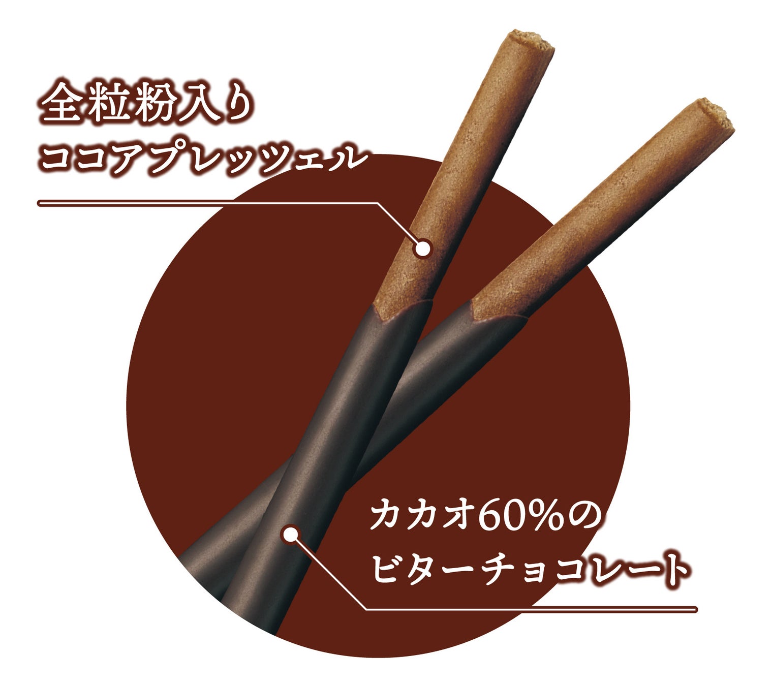 カカオ60%※1のビターチョコレートを、全粒粉入りのココアプレッツェルと合わせました。華やかな香りのエクアドル産カカオ※2を使ったひかえめな甘さと、1袋でカカオポリフェノール403㎎、食物繊維入りがうれしい本格カカオポッキーです。過去に発売していたビター系の商品「メンズポッキー」や「ポッキーデミタス」等と比較して、ポッキー史上もっともビターな味わいです。パッケージはビターな味わいを連想する焦げ茶色と、中央にカカオポッドをイメージしたイラストをレイアウトすることで、大人の方にもピッタリなおしゃれなデザインにしています。