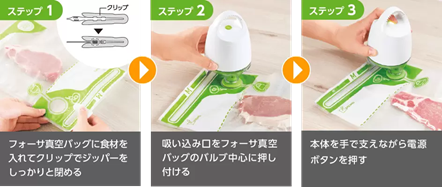 - 使い方はたったの3ステップ!様々な食材を手軽に真空保存!