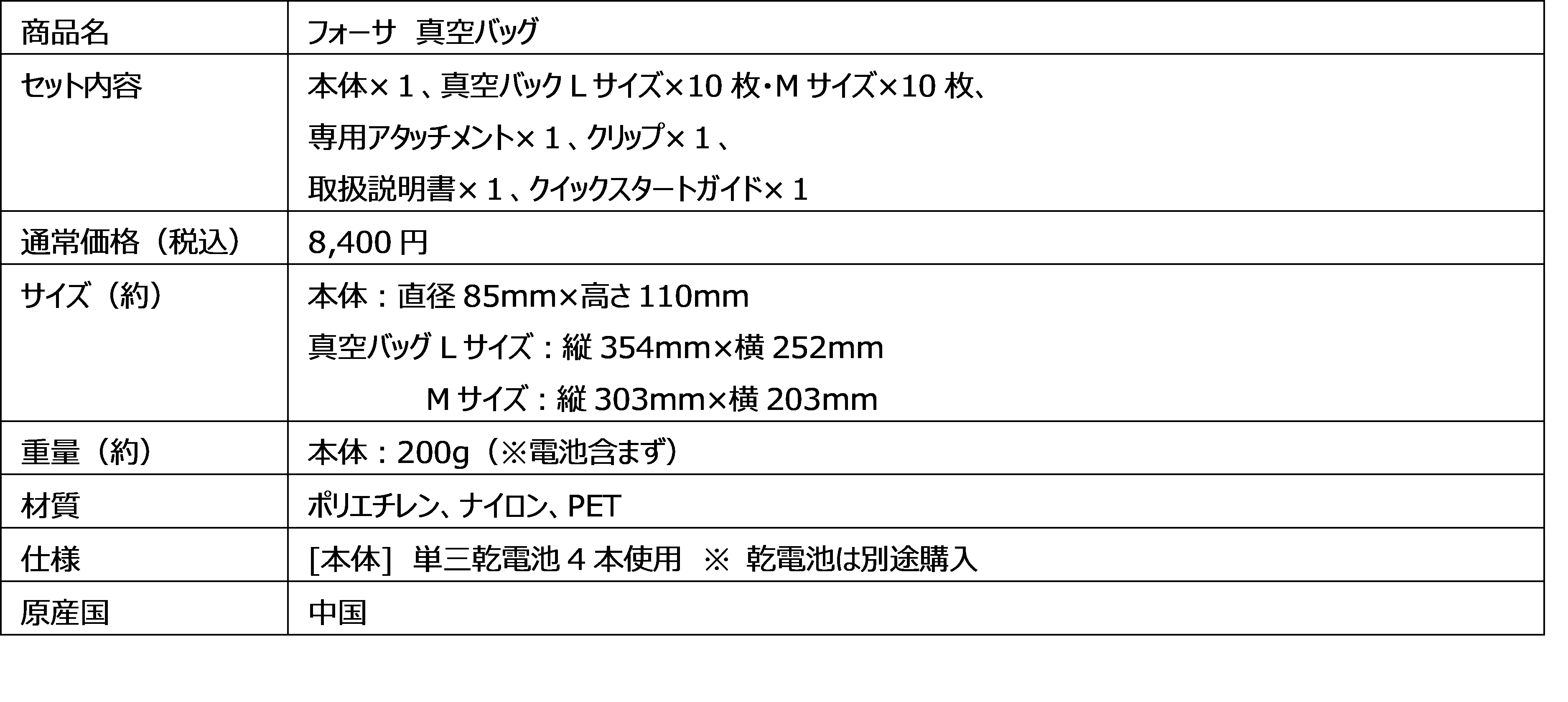 「フォーサ」は、専用コンテナに食材を入れ、本体(真空器)を置いてボタンを押すだけで、真空保存ができる手軽さがご好評いただき、世界累計出荷台数65万台※を突破し、多くのお客様にご愛顧いただいてまいりました。「おかずを作りすぎてしまった」「いつの間にか腐らせてしまい破棄してしまった」「食材をお得にまとめ買いしたはずが使いきれなかった」など家庭に潜む‟勿体ない“を解決できるキッチンツールとして、お客様に長く愛される商品となるべく、省スペースで収納でき、さらに便利な仕様となった「フォーサ 袋タイプ」を新たにラインナップに追加いたします。