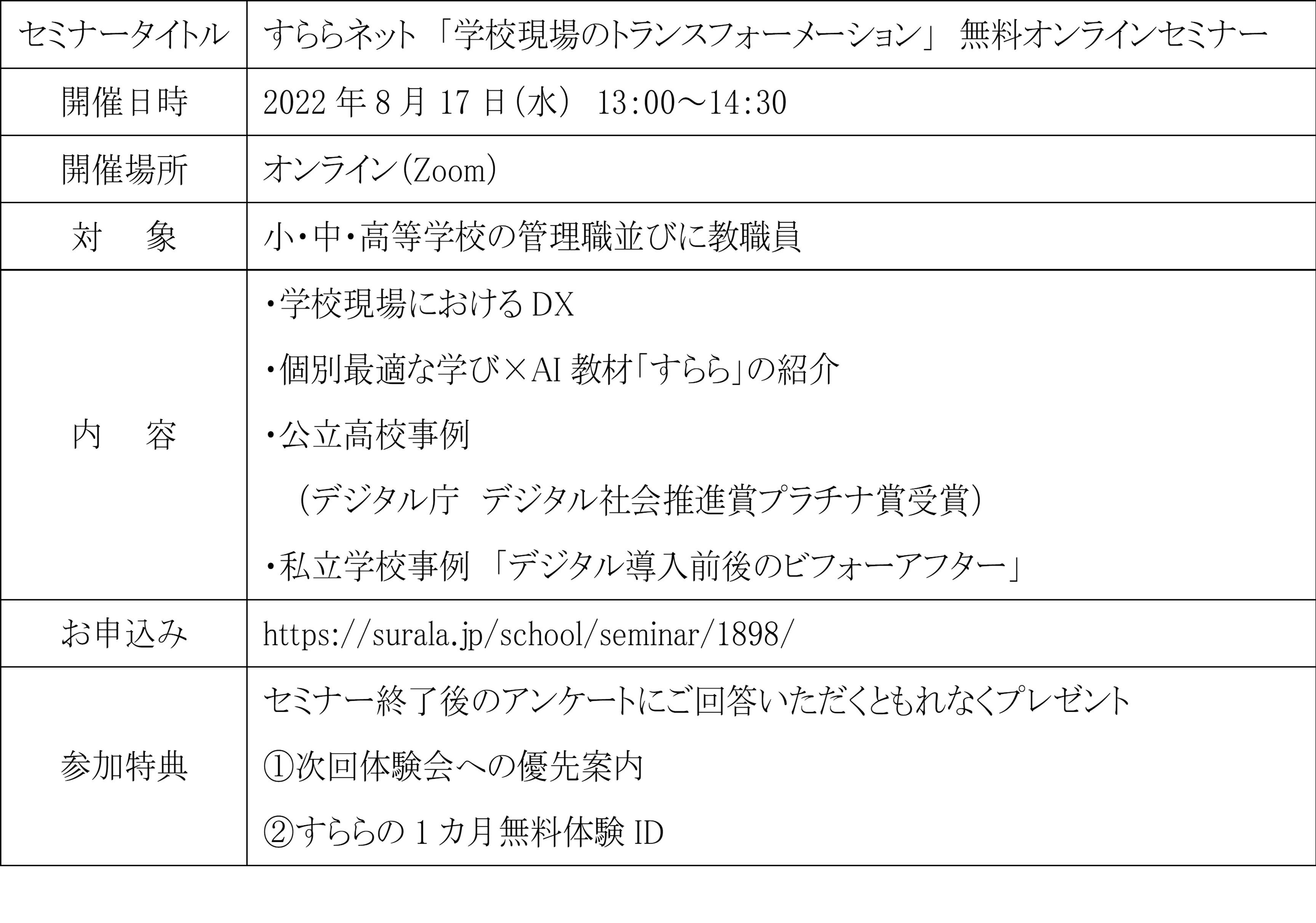アダプティブな対話式 ICT 教材の開発と提供を行う株式会社すららネット(本社:東京都千代田区、代表取締役:湯野川孝彦)は、2022年8月17日(水)13時より、小・中・高等学校の管理職並びに教職員を対象とした無料オンラインセミナー「学校現場のトランスフォーメンション」を開催します。参加申し込みは、WEBサイト(https://surala.jp/school/seminar/1898/)より受け付けています。