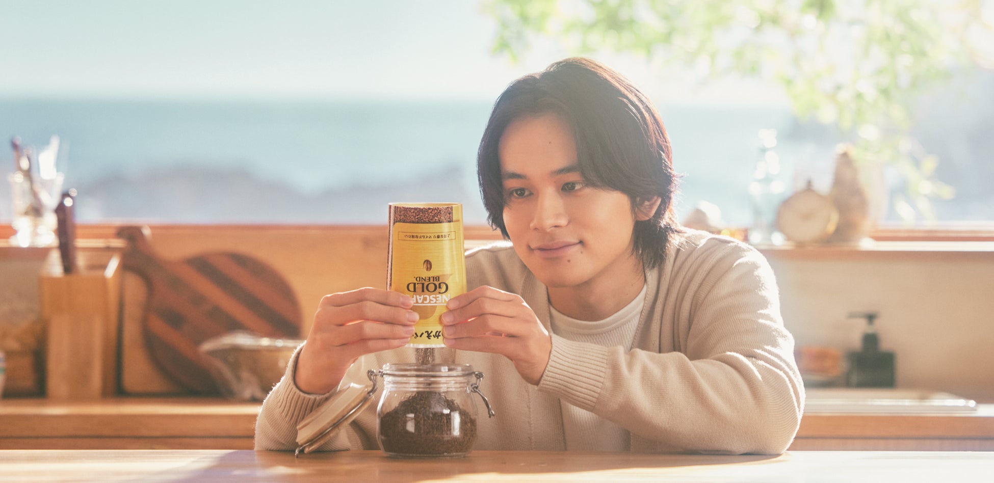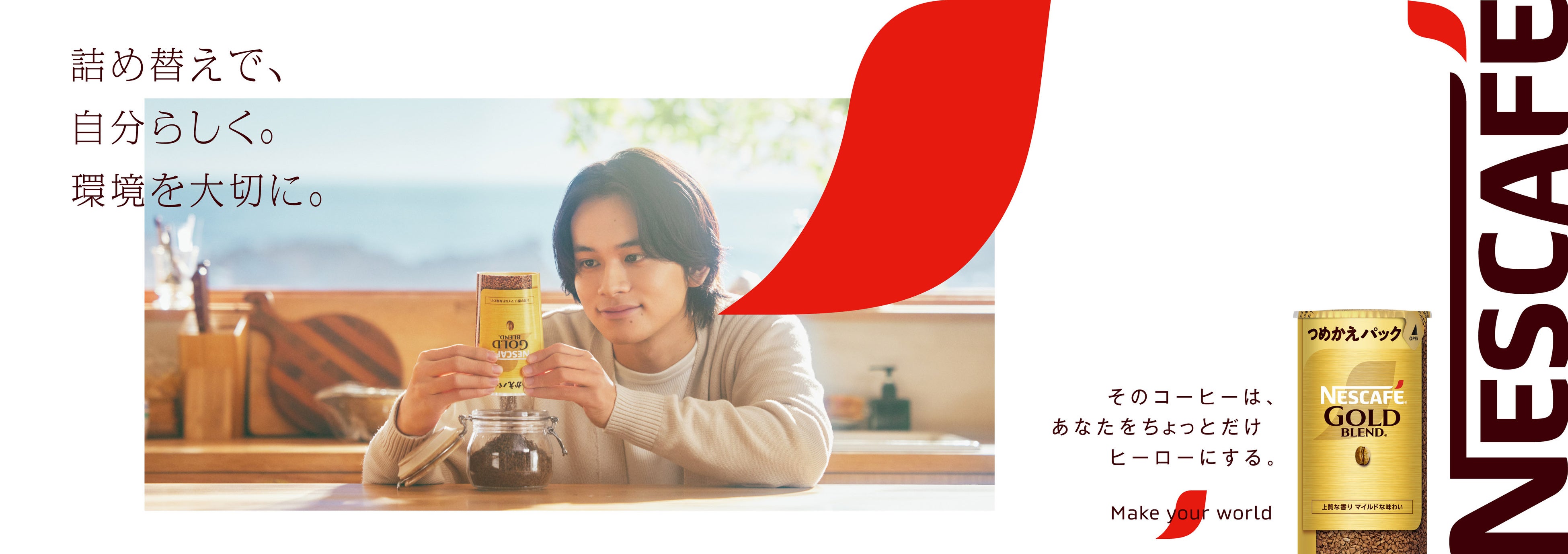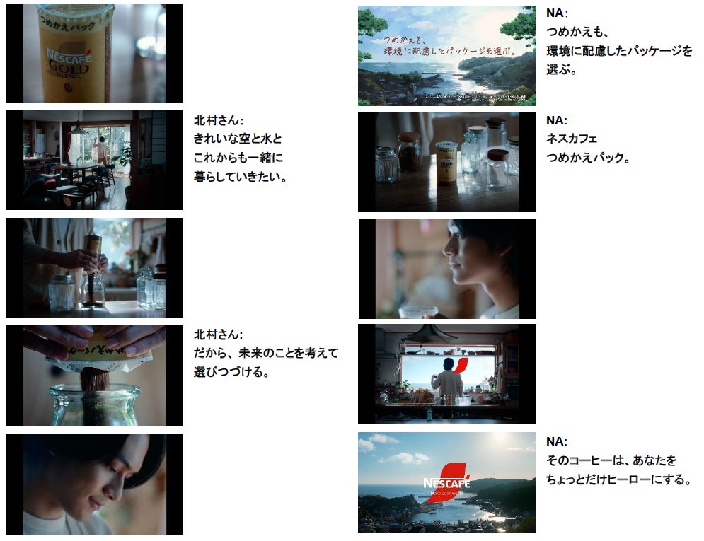 このたび新たに放映を開始するのは、北村 匠海さんが出演するCMの新バージョンです。CMでは、男性(北村 匠海さん)が、自然に囲まれた実家に帰省し、リラックスした雰囲気の中で母親と談笑しながら、「ネスカフェ ゴールドブレンド エコ&システムパック」を使ってコーヒーの詰め替えをする姿が描かれています。好みの容器を選び、コーヒーを「パキっ」とワンタッチで詰め替える様子、そして、海を眺めながらおいしそうにコーヒーを楽しむラストシーンでは、「ヒーロー」にちなんで「ネスカフェ」のアクサン(※フランス語で「アクセント」の意味)マークがマントのように象徴的に使用されているのも見どころです。